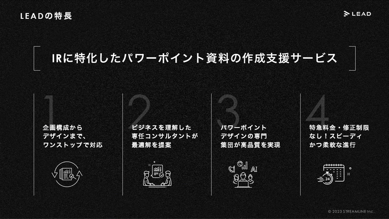 2021年には、資料作成のノウハウと経営企画・IR実務経験者の専門知識を融合させた、IR資料に特化した作成支援サービス「LEAD」をリリースいたしました。企業と投資家間の理解促進とコミュニケーション品質向上を目指して、ストーリー構成からデザインまで一貫したIR資料の改善サポートをする総合的なサービスを展開しております。