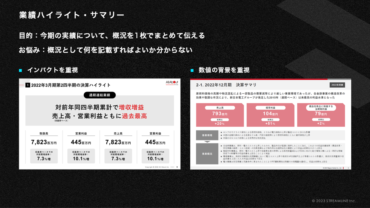 ストリームラインが提供するIR資料作成支援サービス「LEAD」では、100社を超えるIR資料作成支援実績があり、その中から優良事例のご紹介や、資料作成におけるポイントをご紹介しました。