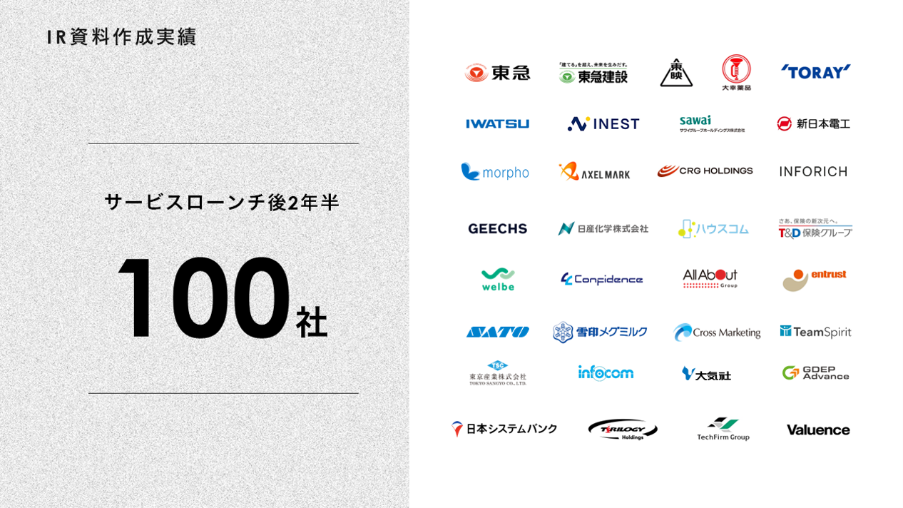 2021年6月にサービスリリース以降、IPO準備段階の企業様から、グロース・スタンダード・プライム市場上場企業様まで各企業様の抱える課題と向き合い、多様なIR資料を作成しております。ご好評により、ご提供開始から2年半でIR資料作成実績は100件を突破いたしました。(2023年11月時点)