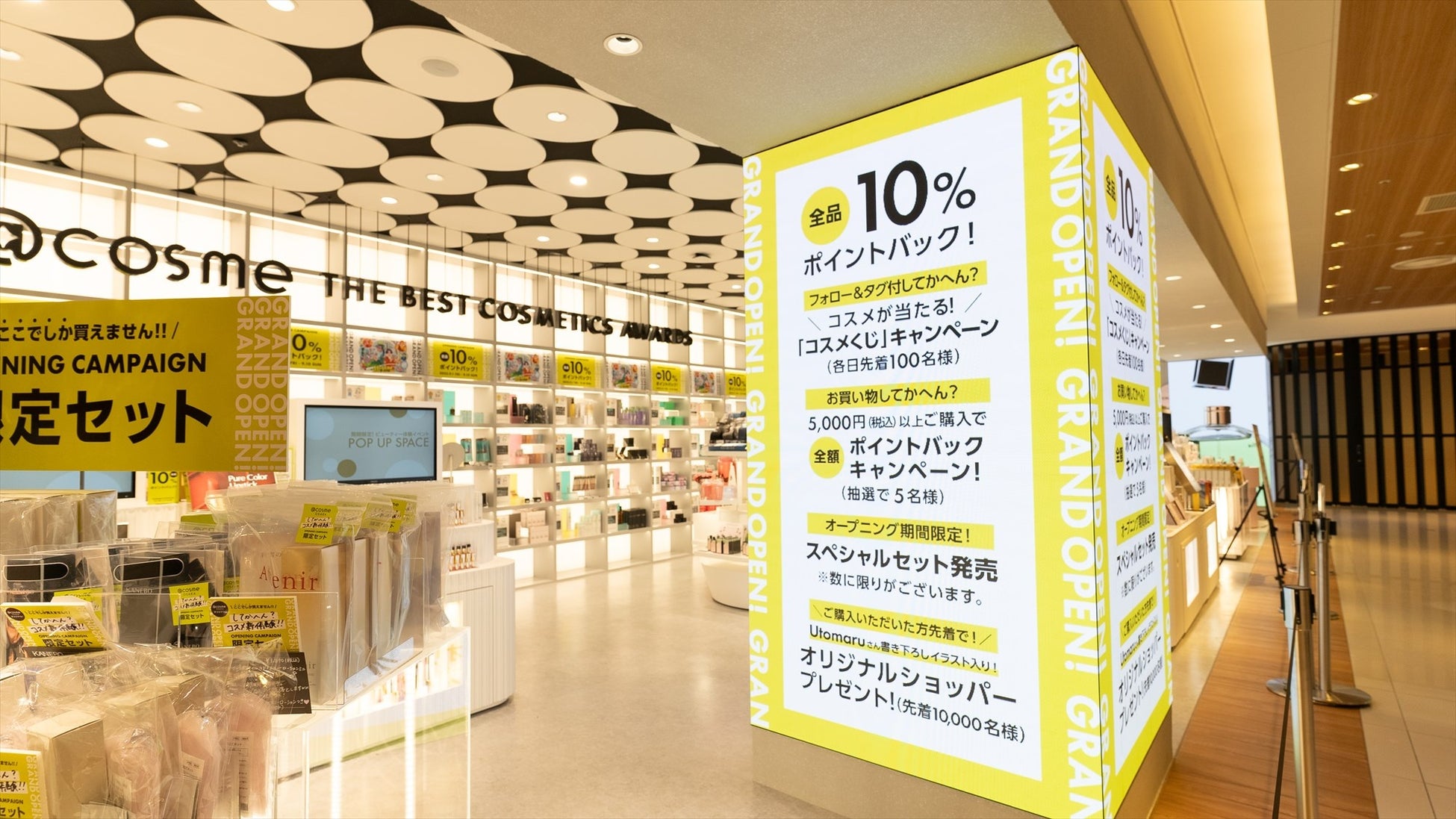 2023年9月にオープンした「@cosme OSAKA」では、レジバックに高精細LEDビジョン、店内フロアに柱LEDビジョンを採用いただき、広いフロアで且つ液晶ディスプレイが多い店内でも、ひときわ目立つとご好評いただいております。