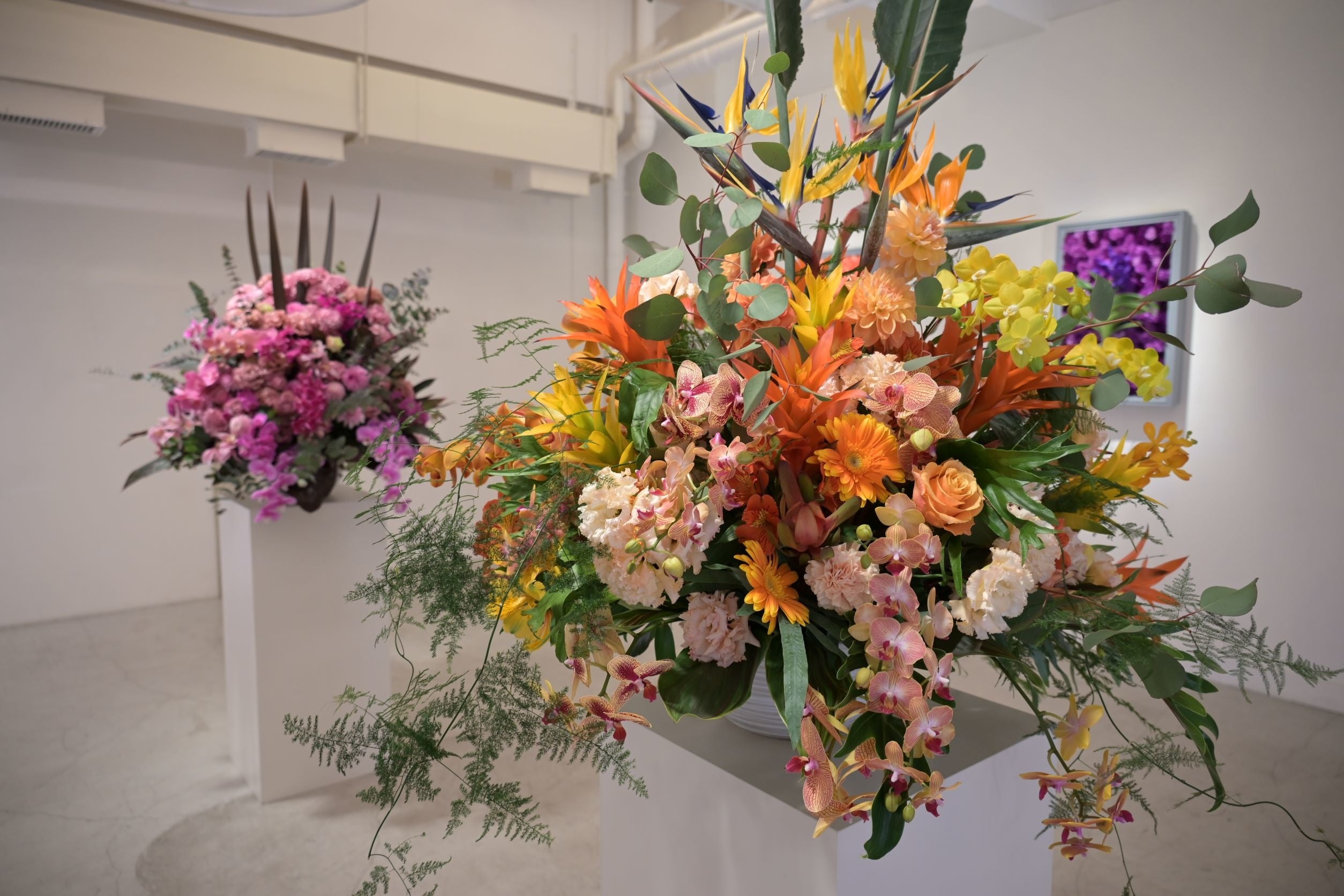 壁には、母の日を象徴するカーネーションを敷き詰めた上に印象的な花や葉を配置し絵画のように仕上げた作品を飾り付けています。フロアには、バラやダリアなど様々な種類の赤い花を取り入れた情熱的な作品や、ストレリチアやランなど南国の花でまとめたエキゾチックな作品など、個性豊かな6種類を彫刻作品のように展示しました。