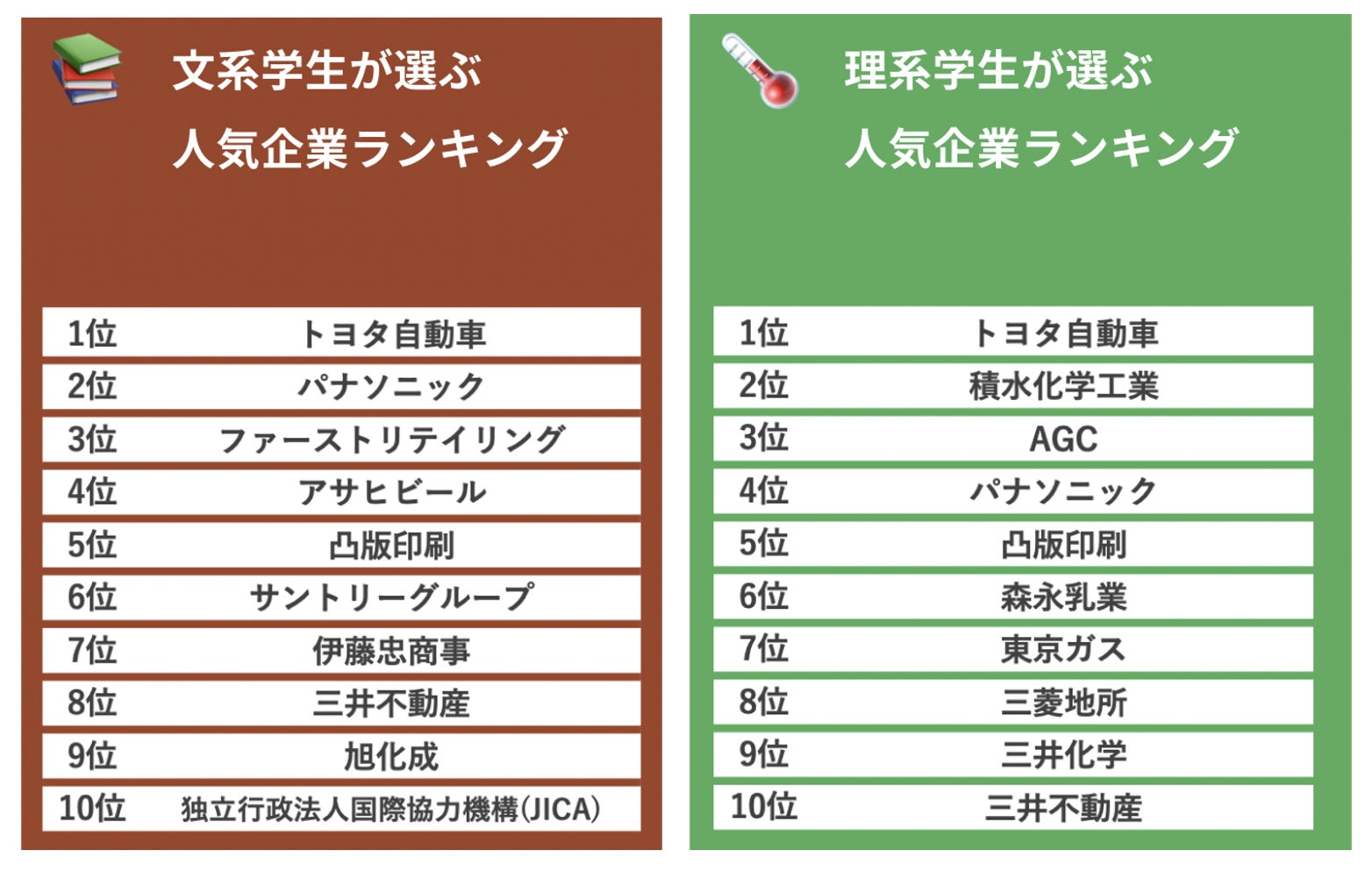 文系学生のみのランキングでは、トップはトヨタ自動車、2位はパナソニック、3位はファーストリテイリングが入りました。理系学生のみのランキングでは、トップはトヨタ自動車、2位に積水化学工業、3位にAGCが入りました。