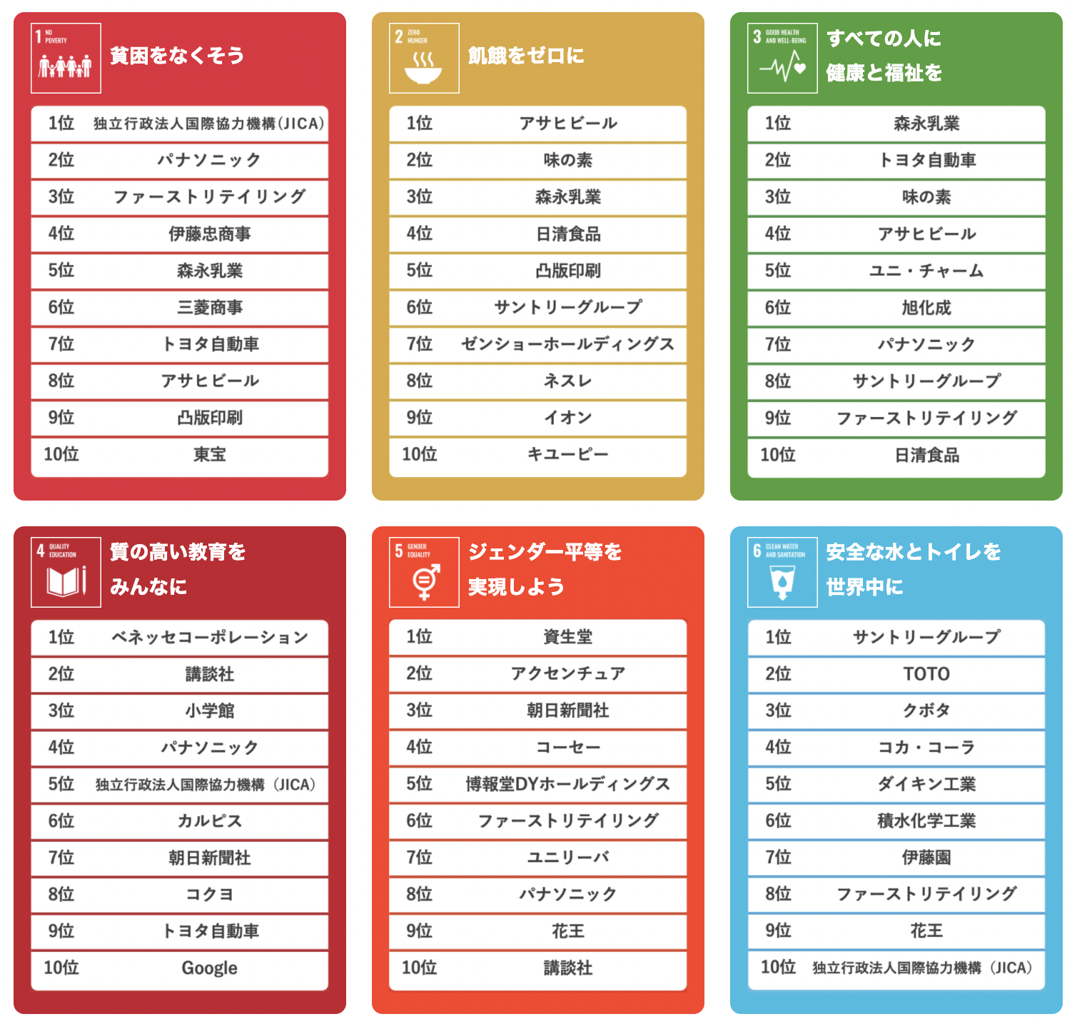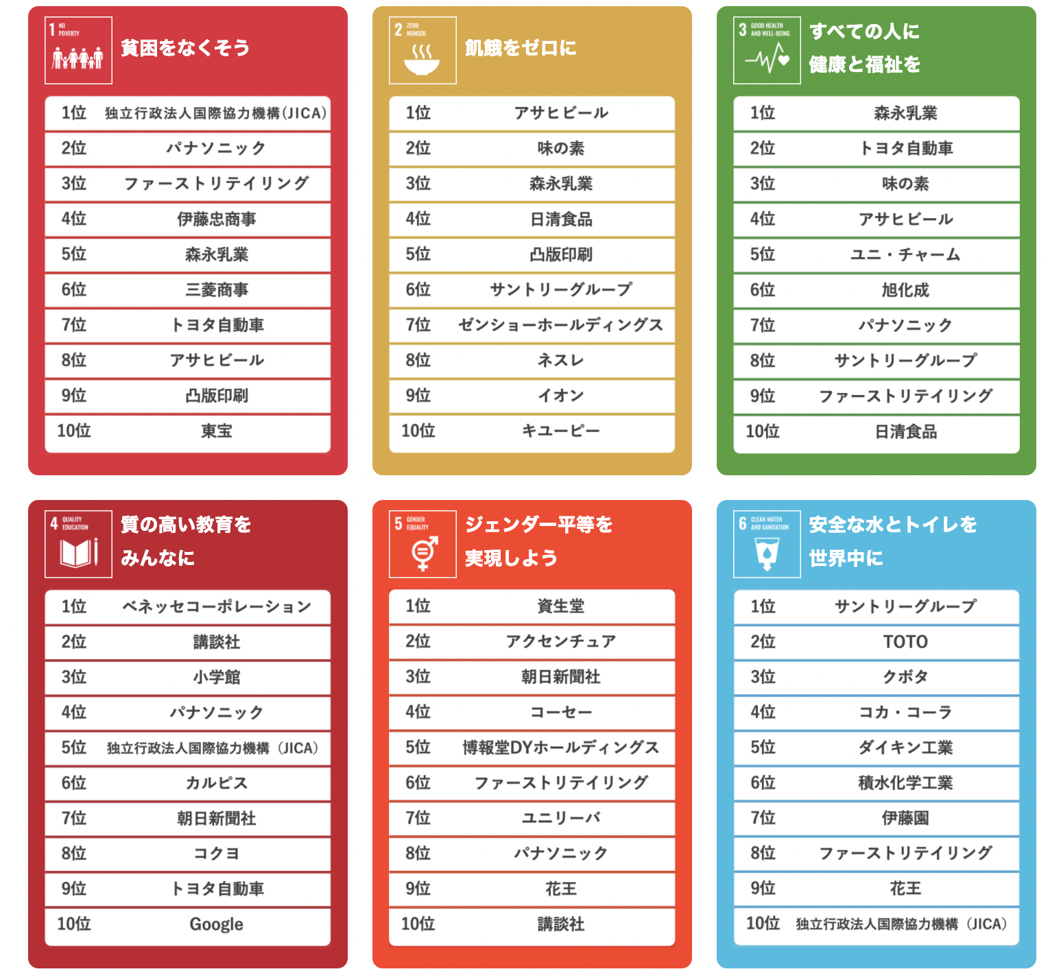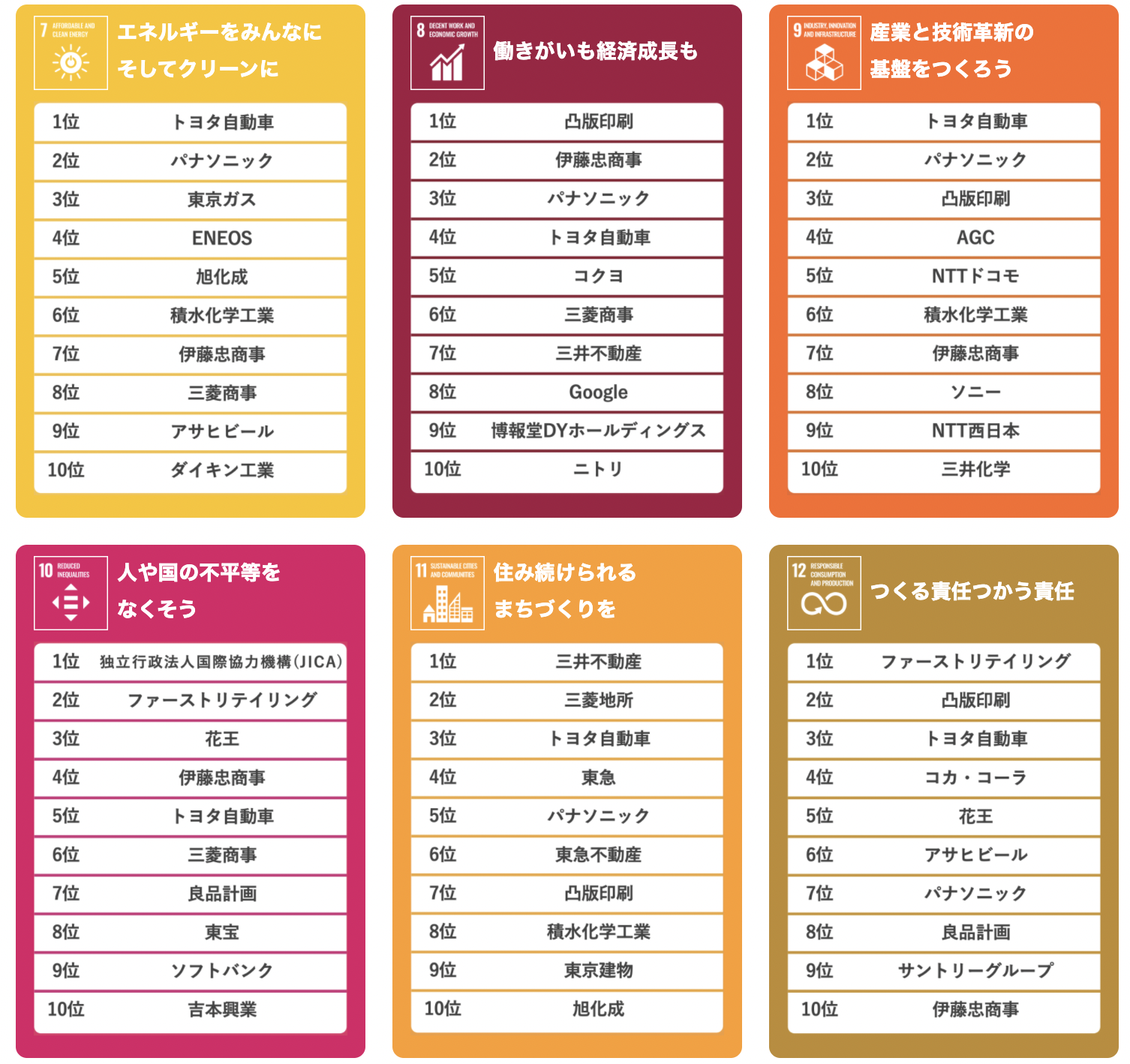 総合ランキングトップはトヨタ自動車、2位はパナソニック、3位は凸版印刷が並びました。一般消費者向けサービス企業だけではなく、法人向け企業もランクインしていることから採用シーンを含め企業ブランディングとしてSDGsに注力しているイメージが浸透していることが伺えます。