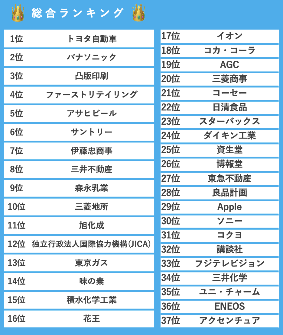 総合ランキングトップはトヨタ自動車、2位はパナソニック、3位は凸版印刷