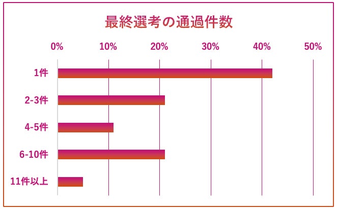 最終選考の通過件数は1件が42%と最も多く、次いで2-3件、6-10件がそれぞれ21%であった。