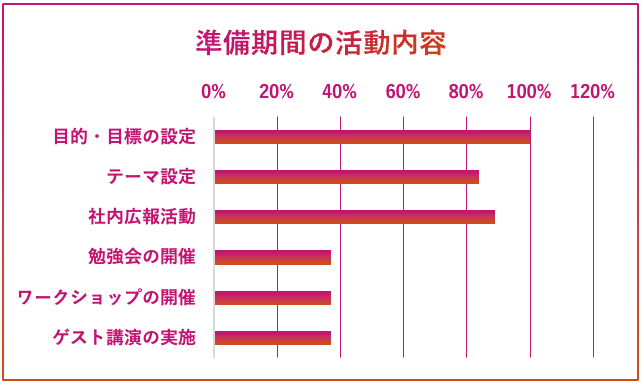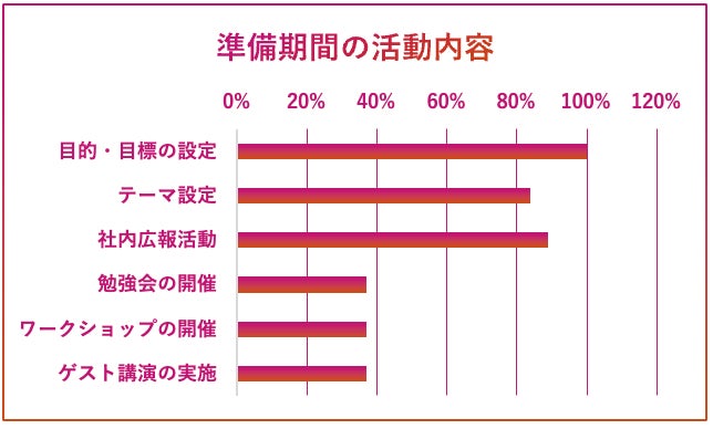 準備期間においては目的・目標の設定やテーマ設定などを行う企業がそれぞれ100%、84%と多い。テーマの設定は中期経営計画などとの整合性を重視する企業が多い。