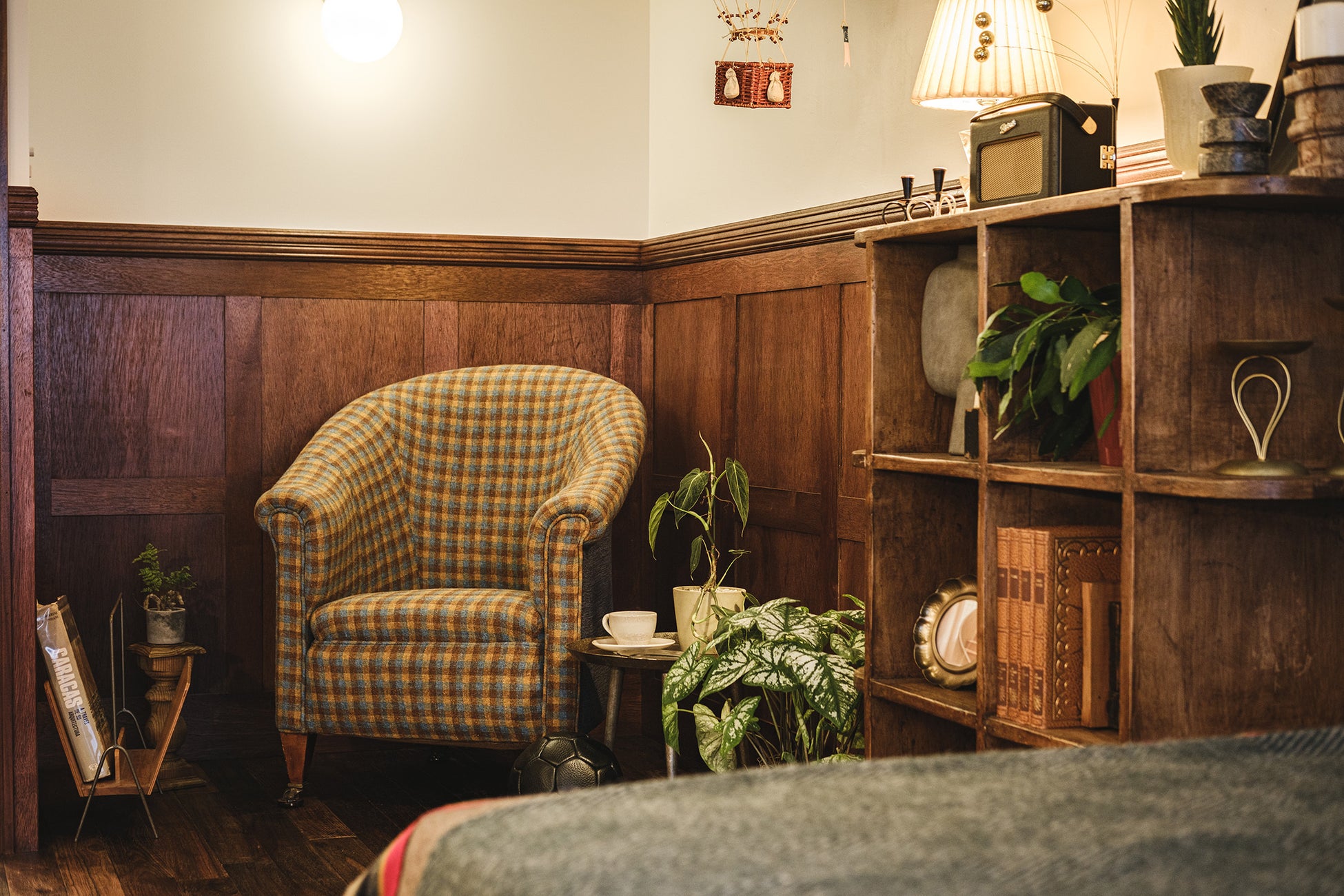 そんな忙しない日常の中で、コーヒーや本を片手にひとりの時間を贅沢に過ごすことができる “ヌックスペース”を兼ね備えたお部屋を作りました。暮らしや気分のオンオフを切り替えられるように照明にもこだわり、ムードある明かりや、壁や床など天然素材を用いた落ち着きのある、重厚感を楽しめるホンモノの素材に囲まれてゆったりと自身を磨き上げていくような空間に仕上がりました。スコットランドの伝統衣装である「Kilt」。ウッドウォールで切り替えられた壁面は、まるで腰に巻き付けるキルトスカートのよう。格子柄はキルティングの「Quilt」にも通じる手仕事の温かみと安心感を感じられるデザインになっています。
