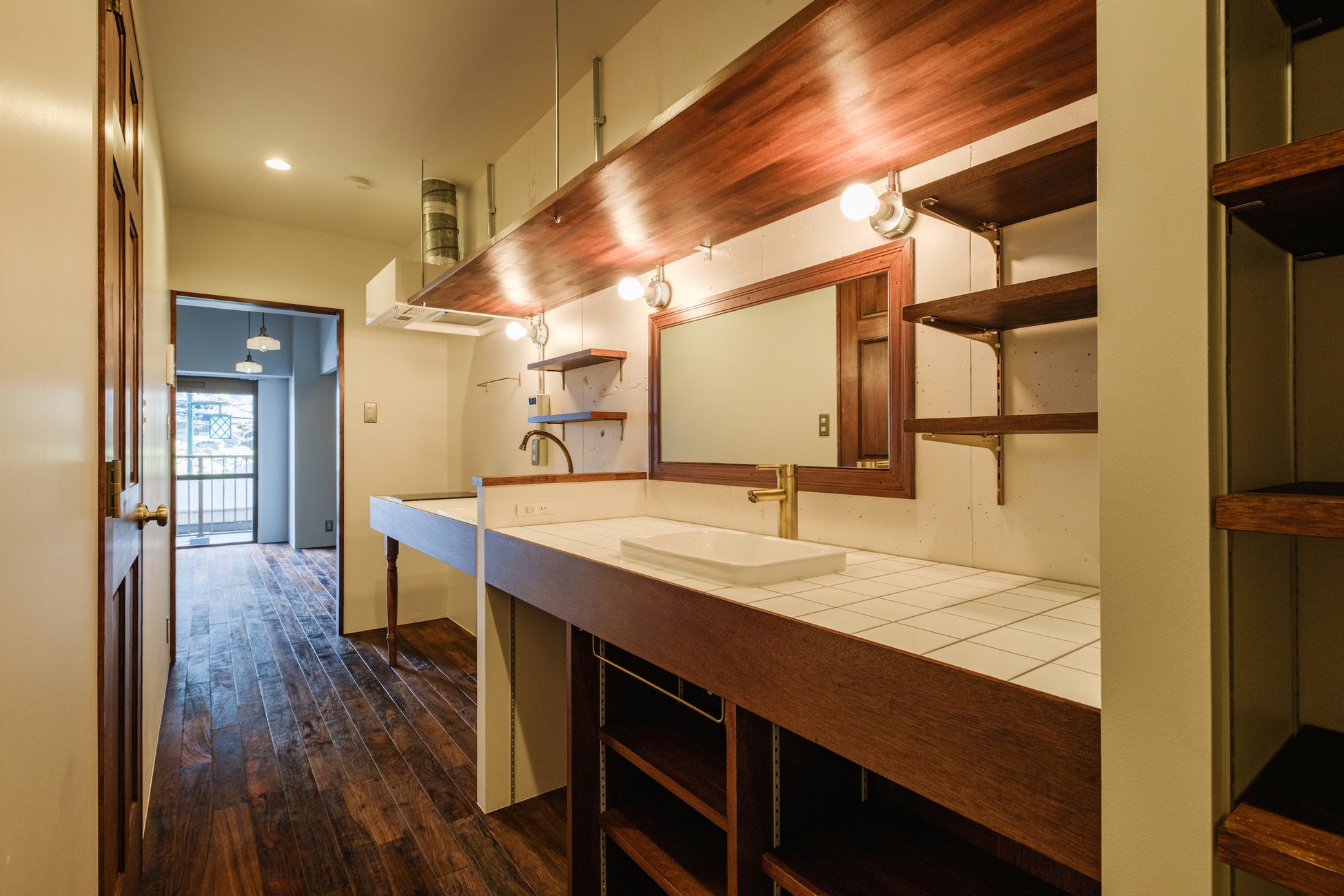 玄関に入り最初に目につくのは、「KiLT」のもうひとつの特徴であるゆったりとした洗面スペース。ひとつひとつ丁寧に職人の手作業で貼られた白いタイルとアンティーク調のカランなどが醸し出すこの空間は、自分を磨き上げることができる空間となっています。キッチンと並びで作られているとは思えないほどの広々とした空間で、キッチンの水まわりと洗面スペースの水まわりが2つに分かれていて、洗面スペースのシンク下にはスツールを置くスペースもあり、朝の身支度、帰宅後の就寝前のセルフケアの時間をゆっくりとって、自分を高めることができるスペースです。ゆったりと広々とした洗面スペースは、セルフケアを毎日のルーティンとして、自分と向き合うための時間を持ってほしいという想いで作られています。