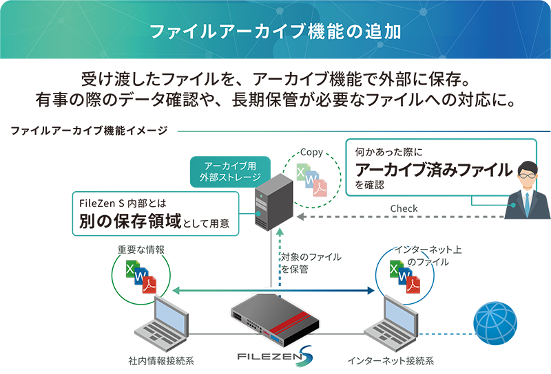 受け渡しファイルのアーカイブ機能を追加しました。金融業界に代表される、ファイルの原本保存や、厳密な証跡を求める業界で強く求められる機能です。