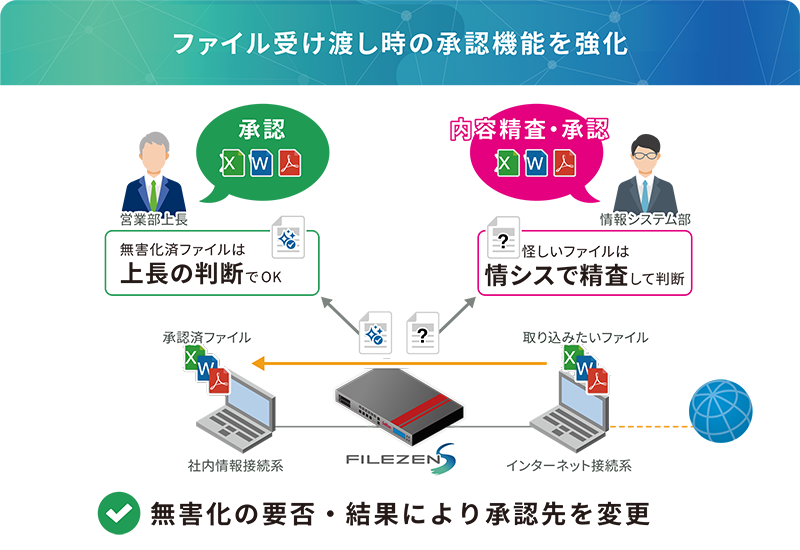 無害化済の機密ファイルは上長が即座に承認、(無害化できない)マクロ付きのOfficeファイルは情報システム部門で精査するなど、業務の効率化とセキュリティの向上にも役立ちます。