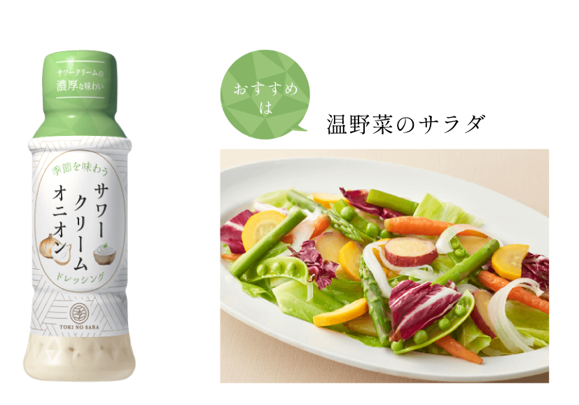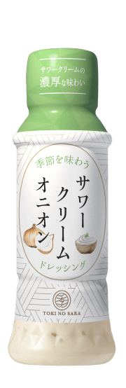 この度の追加アイテム『季の皿 サワークリームオニオンドレッシング170』は、サラダ専門店等で乳製品等でつくる「ランチドレッシング」が定番人気となっていることに注目し、その原料としてよく使われている「サワークリーム」に、ドレッシング定番フレーバーのたまねぎを加え、「サワークリームオニオン」味のクリーミーなドレッシングに仕上げました。