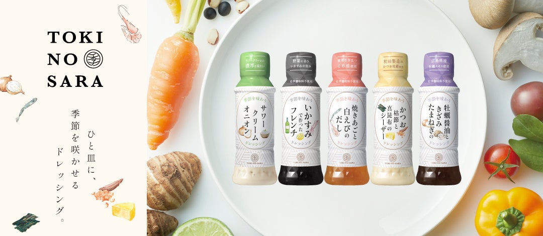 『季の皿(ときのさら)』シリーズは、旬の食材と野菜をふんだんに使って作る「主菜・主食になる季節のサラダ」をご提案。ドレッシングを通じて、季節の移ろいを感じながら健やかに暮らす、作る人と食べる人がこころもおなかも満たされる食卓を応援します。