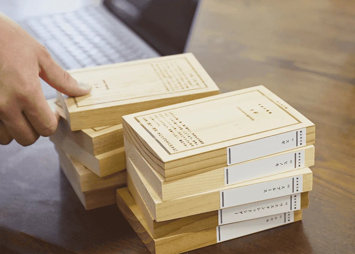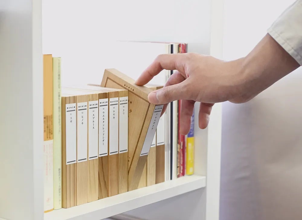 森未来文庫は、A6サイズ・文庫本型の木材サンプルです。まるで本棚に並べる一冊の本のように、気軽に手に取り、じっくり読むように木材に触れることができます。