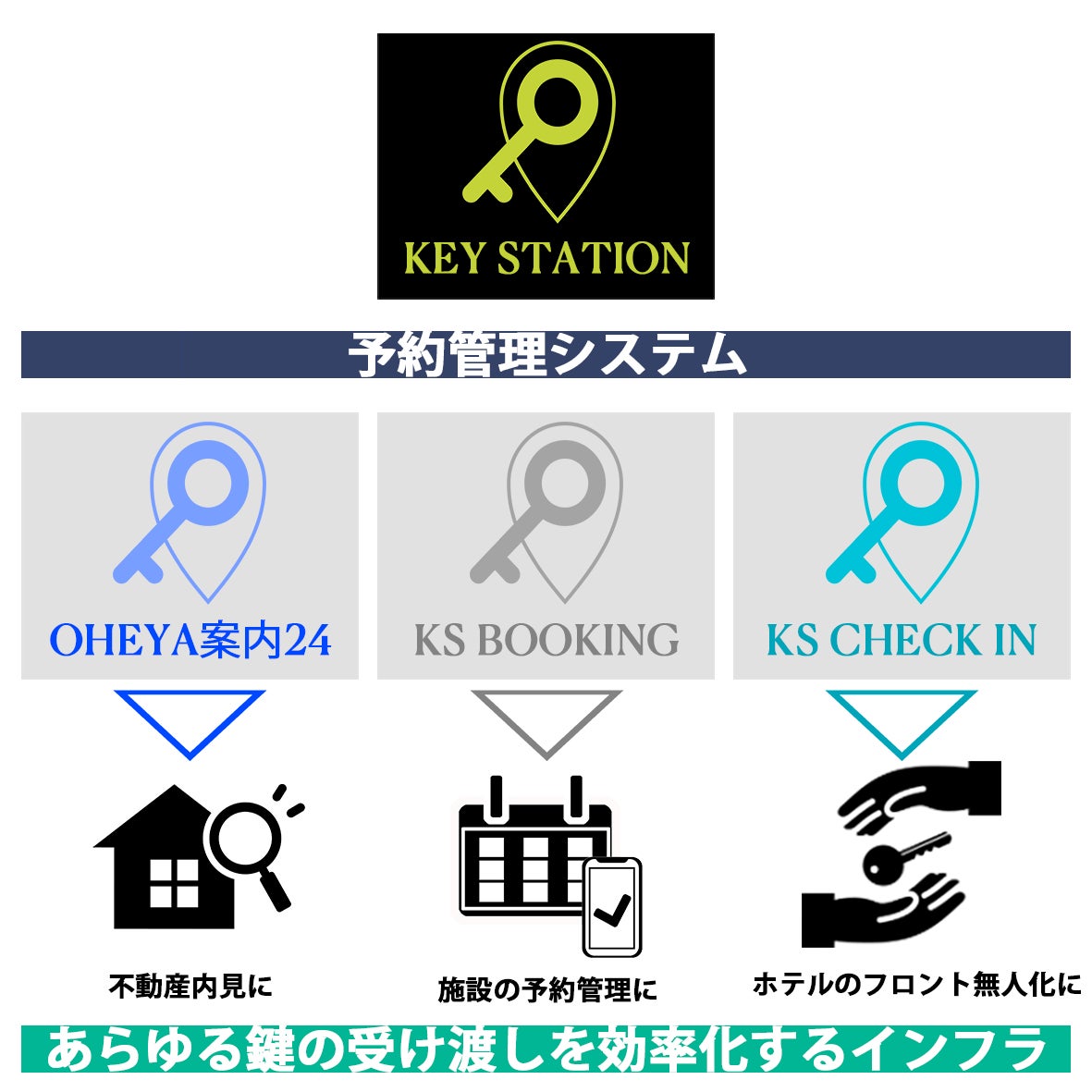 KEY STATIONは、「人々の『時間』と『場所』の自由を実現する」というビジョンのもと、あらゆる鍵(物理鍵・デジタル鍵)の管理・予約管理・本⼈確認・現地案内の機能をひとつにして、予約から利用までいっさい人と接触することなく鍵の受け渡しを可能としたサービスです。利用履歴やeKYC(※1)の技術などを組み合わせ、鍵の利用履歴をリアルタイムで管理することにより、あらゆる施設やサービスの利⽤において「誰が」「いつ」「どこで」「何のために」鍵を受け取ったのか(受け取る予定なのか)といったトレーサビリティを当社は実現します。(※2)