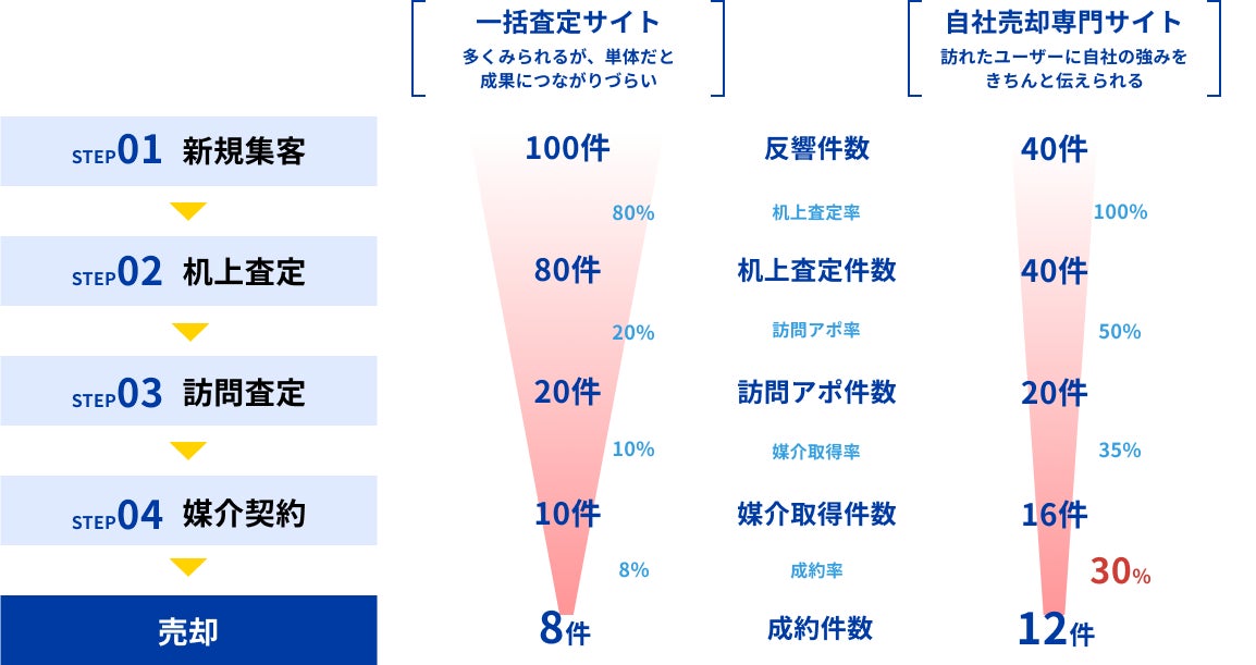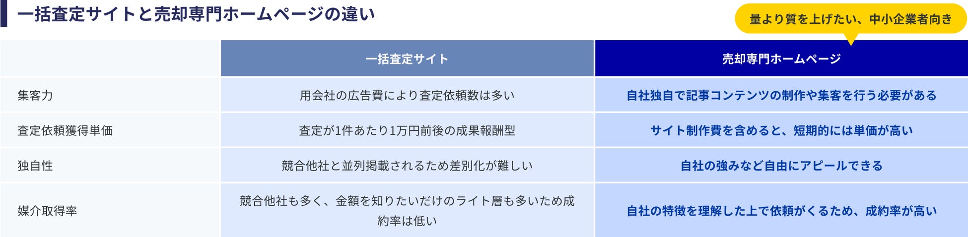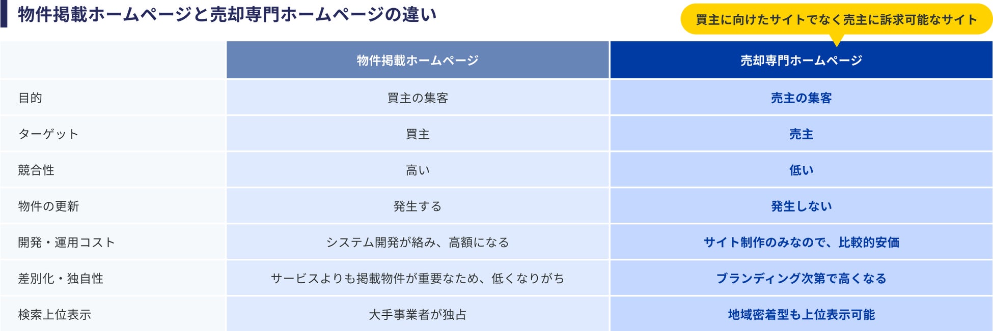 一括査定サイトだと競合他社に埋もれてしまい、売主様に自社のことを認知してもらうことは難しいですが、売却専門ホームページで訴求できない自社の強みをアピールし認知いただくことで、集客数と成約率の両方を向上させます。