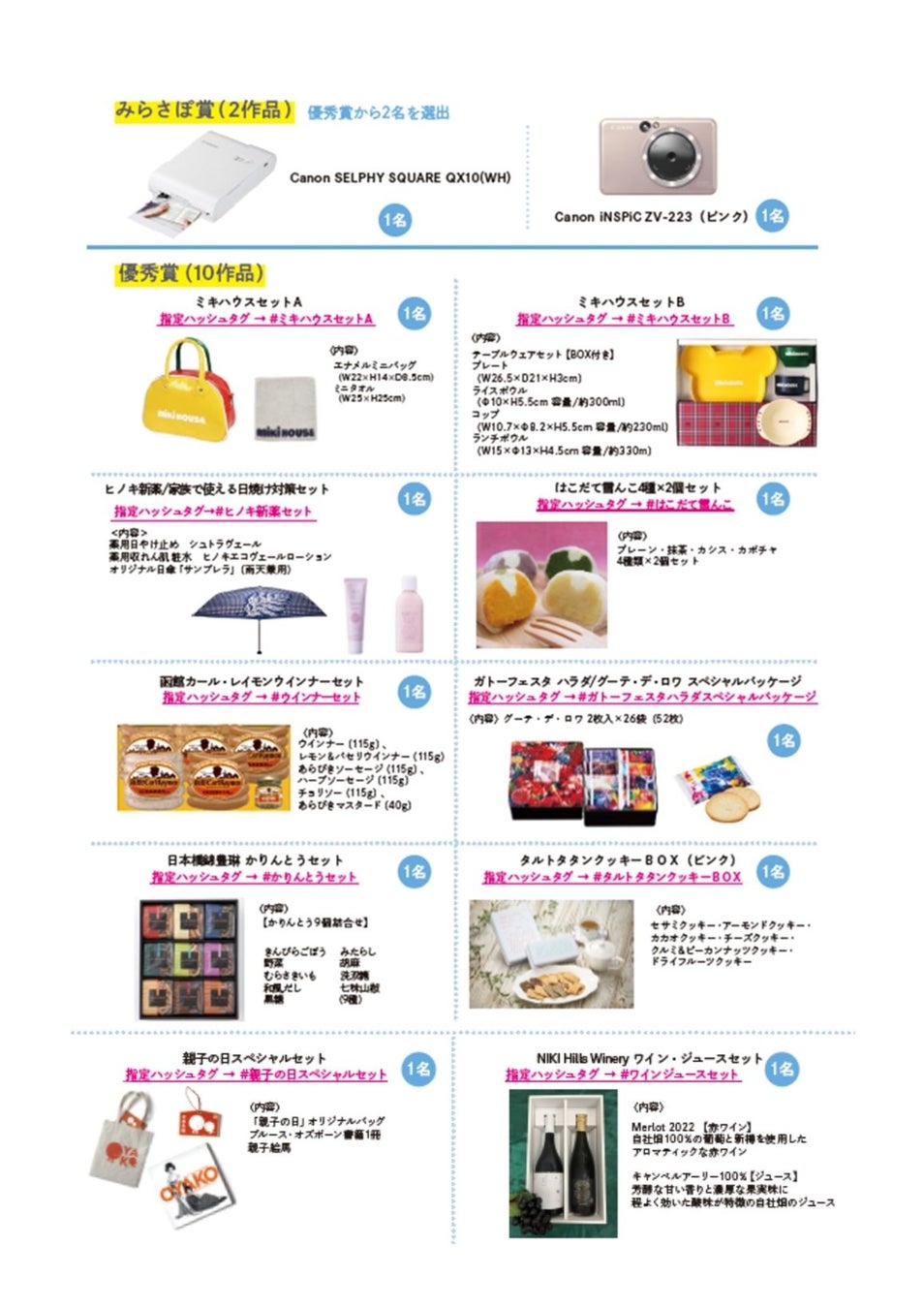 写真の説明をテキストで明記し、「@mirasapodac」をタグ付けして応募用のハッシュタグ 「#ぼくちゃれ2024」 「#親子の日」 と希望賞品の指定ハッシュタグを付けて写真を投稿。