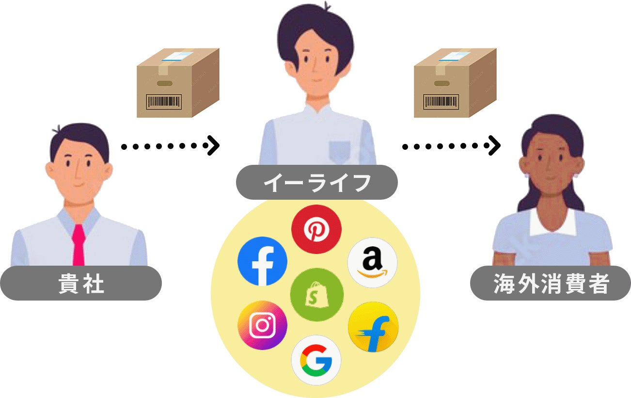 越境ECにおいては、ブランディング可能な自社ストアを主軸とし、顧客親和性の高いSNSでも同時にストア展開を行い、さらにはAmazonやインドで成長著しいFlipkartなど現地マーケットプレイスを活用した販売網をグローバルで展開するグローバルオムニチャネル戦略が必要不可欠です。イーライフは販売代行サービスの提供を通して、日本企業のグローバルオムニチャネル実現をワンストップでサポートします。