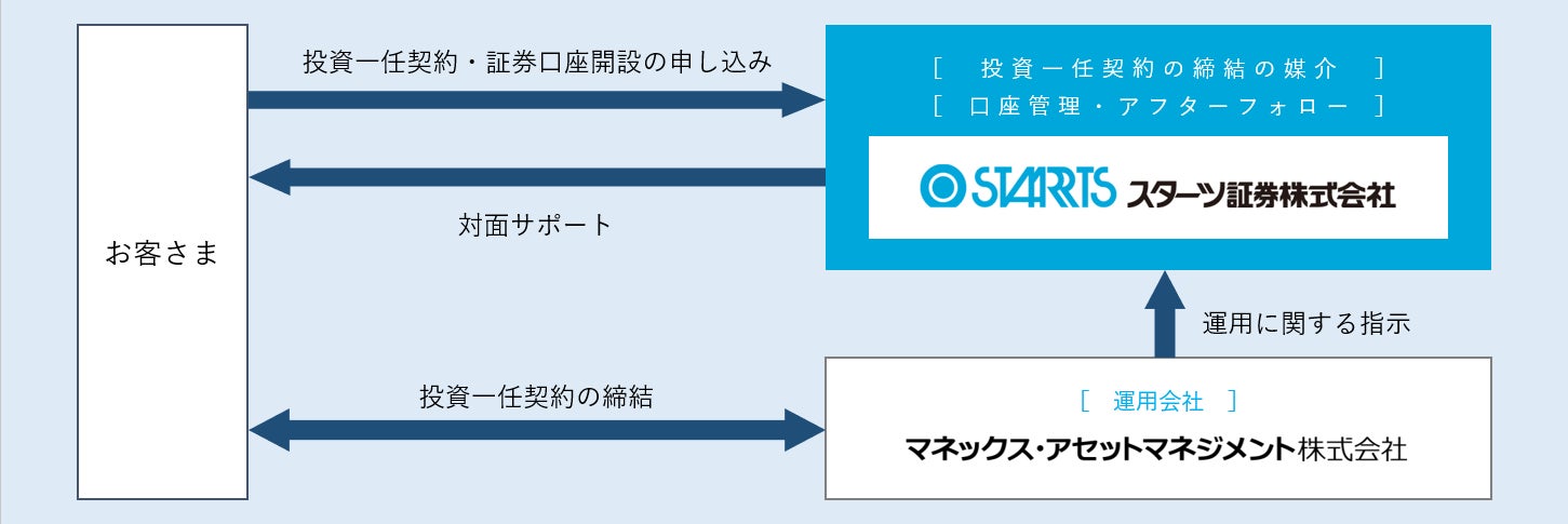 スターツ証券株式会社(本社:東京都江戸川区、代表取締役社長:河合 保範、以下「スターツ証券」)と、マネックス・アセットマネジメント株式会社(本社:東京都港区、代表取締役社長:萬代 克樹、以下「マネックス・アセットマネジメント」)は、2022年7月1日より投資一任運用サービス「スターツ証券ファンドラップON COMPASS+(オンコンパスプラス)」の提供を開始したことをお知らせします。
