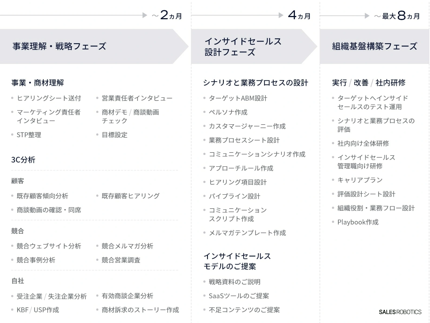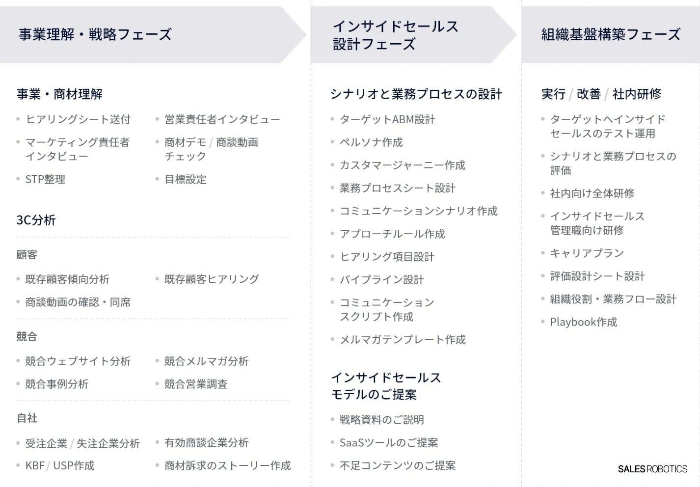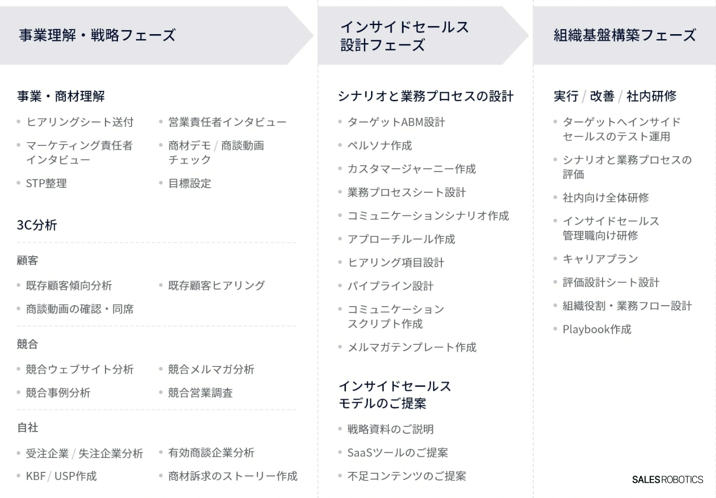 そういった問題を解決するため、SALES ROBOTICSのこれまでの経験とノウハウを結集し、『インサイドセールス立ち上げ構築支援サービス』をリリースすることといたしました。