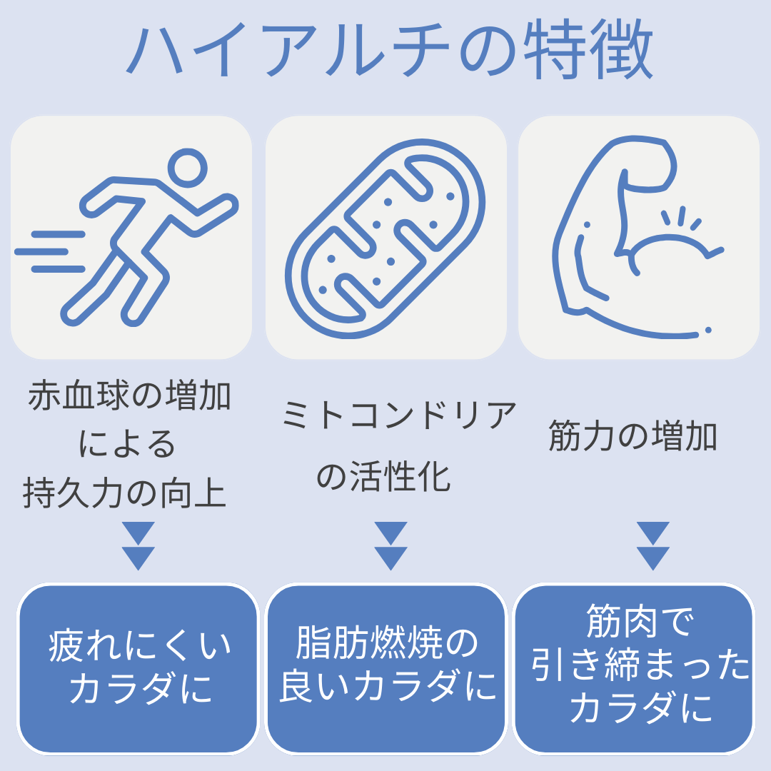 そして、高地トレーニングは、心肺機能や持久力が向上という疲れにくいカラダづくりにとどまらず、ミトコンドリアを中心とする、細胞の代謝を高めることによって、ダイエットからアンチエイジングまで寄与することがわかってきています。(低酸素環境下での運動効果に関する詳細こちら:https://high-alti.jp/)