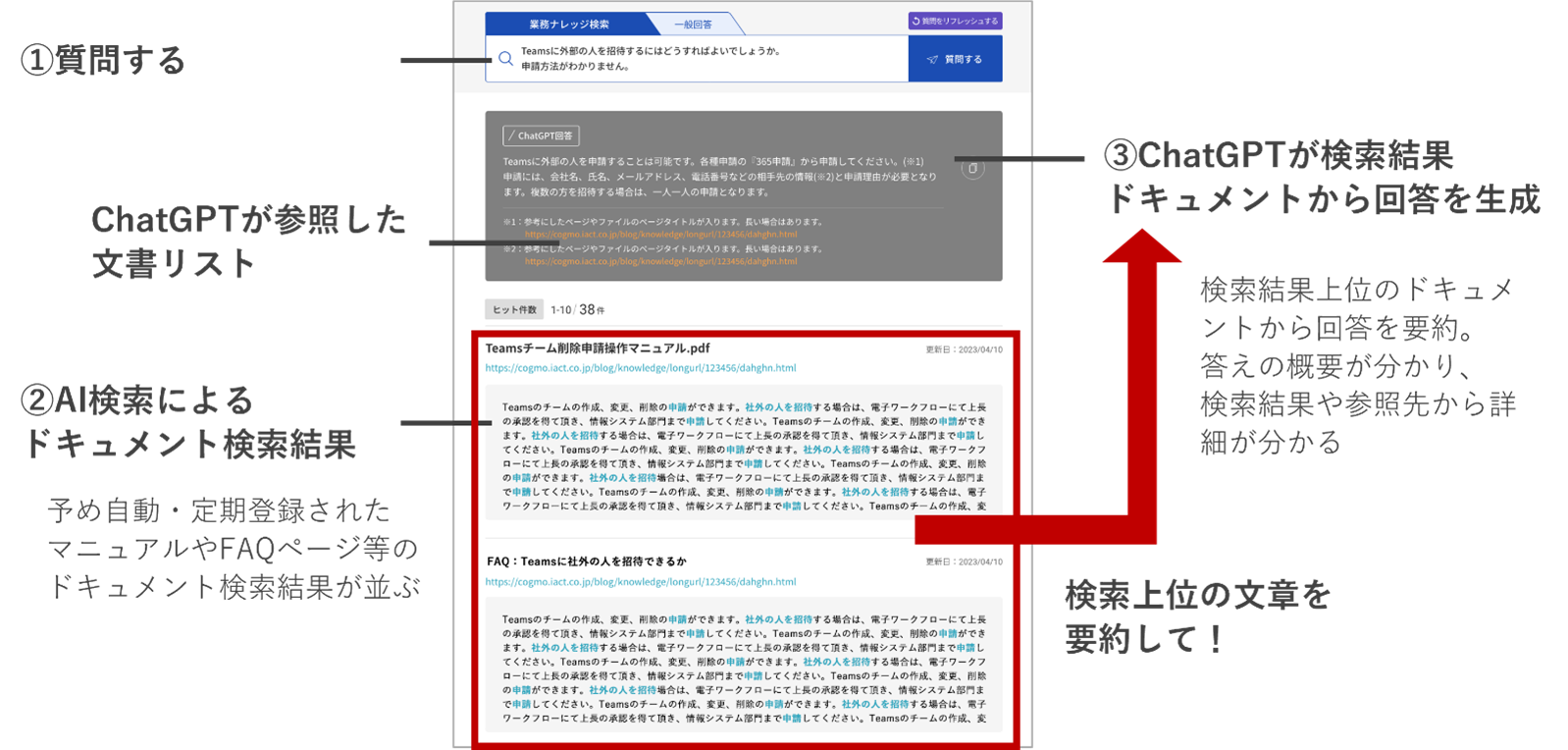 実証実験ではGPT-3.5バージョンとGPT-4バージョンも利用し回答生成を評価。両者の特性や、データ容量・利用料金などのバランスを検討いただけるデータ・情報を得て頂きました。結果、最適な業務適用範疇を実際の業務を通じて判断していくフェーズに移行することをご選択、検索対象の情報をより効果的になるように設定してご利用頂くこととなりました。フェーズ移行の背景には、AI検索『Cogmo Search』の検索精度のご評価と、「Cogmo Search+ChatGPT連携の内容や特性が理解できたことと、今後の活用方法を検討するためのデータ・情報を得ることができた。」と、何をどう改善すれば良いかを開示でき、判断いただけるCogmoならではのChatGPT連携の仕組みがありました。