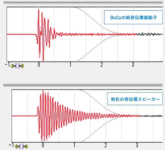 また、BoCoの純骨伝導®︎Bone Phone®は空気伝導イヤホンや一般的な骨伝導振動子に比べ、インパルス応答の収束が早いため(※1)、入力波形に対する動的分解能が高く、音源に忠実な再生ができます。そして、優れたインパルス応答特性をベースに独自のオーディオ制御技術を加えることで、よりながら聴きに適した音質を実現しました。ボーカルの声やピアノや弦楽の音の再現性はとても優れています。