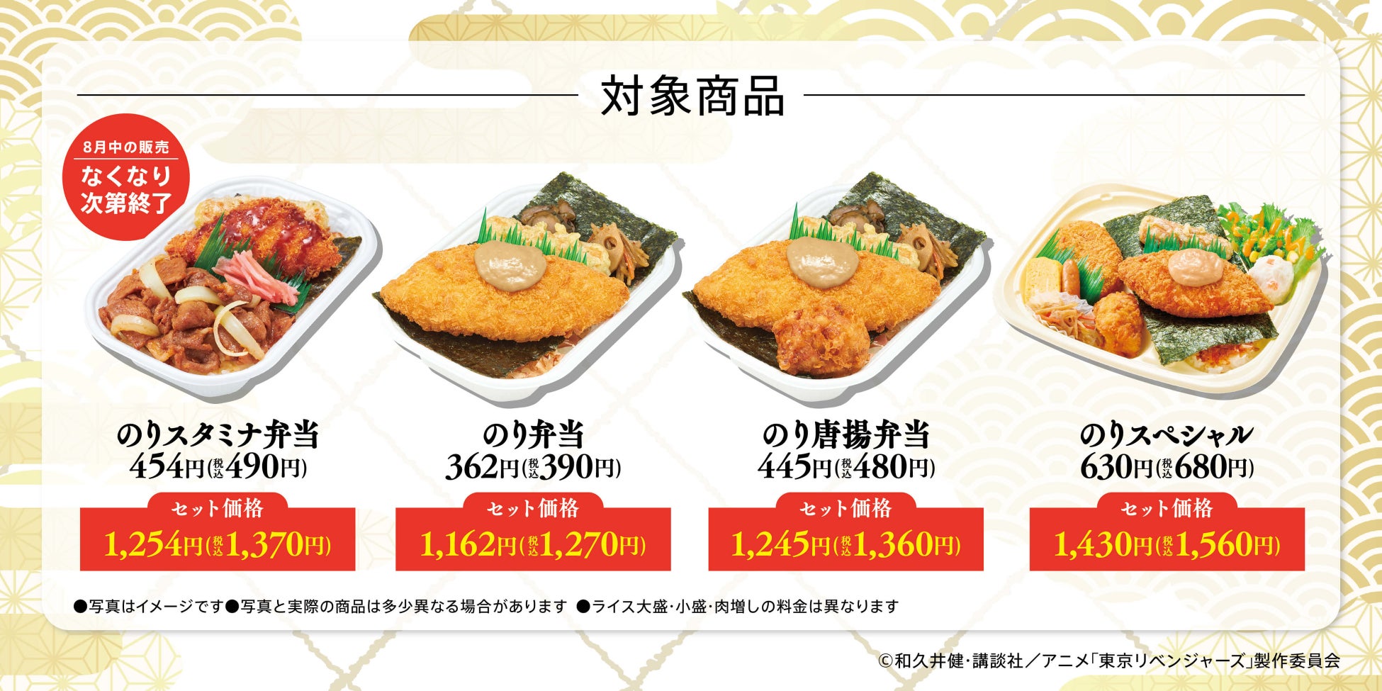 対象商品は、のりスタミナ弁当(8月中販売)のほか、のりシリーズ計4商品となっています。尚、東京のりベンジャーズオリジナルアクリルスタンドは、なくなり次第終了となります。ご了承願います。