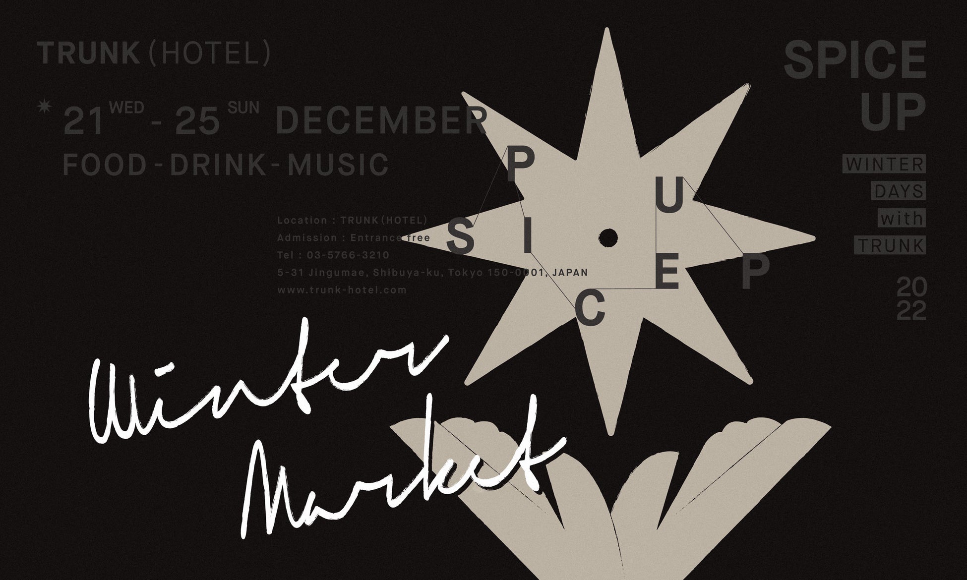 渋谷区・神宮前のブティックホテルTRUNK(HOTEL)は、現在「SPICE UP WINTER DAYS with TRUNK」を開催しており、期間限定のフード&ドリンクをはじめ、さまざまな企画を実施しています。期間中最後の5日間(12月21日 - 25日)は、寒い季節に心と身体をあたためる屋外イベント「TRUNK WINTER MARKET 2022」を開催し今年のホリデーシーズンを締めくくります。