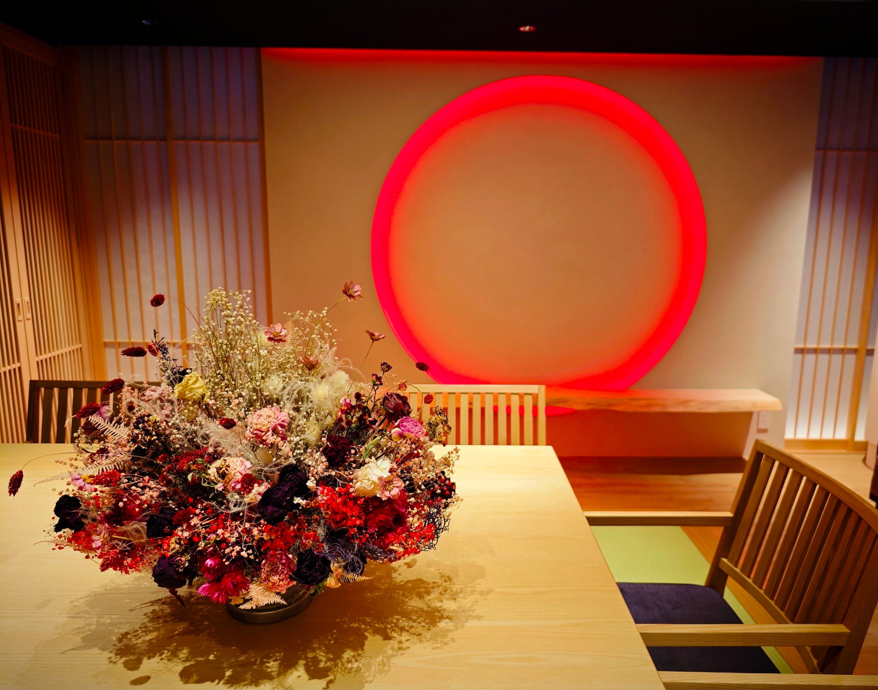 数時間で捨てられてしまう予定だった祝い花にひと手間を加え、ドライフラワーを使用した長くお楽しみいただけるオブジェとして、その後「B-RAVE」スタジオに展示し、文字通り「花」を添えています。