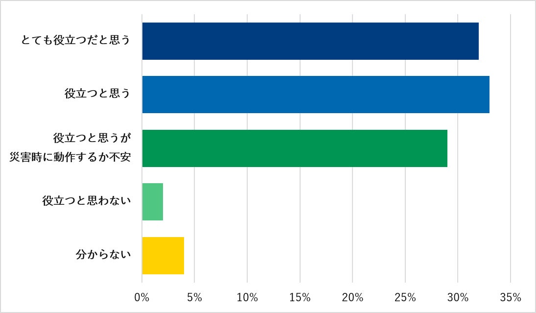 9割以上の方が、被災時にお子さまの現在地を把握できる「子ども用GPS」が役立つと考えていることが分かりました。一方で、「役立つと思うが、災害時に動作するか不安」と回答されている方も3割弱存在し、通信インフラに対する懸念を抱いていることが伺えます。