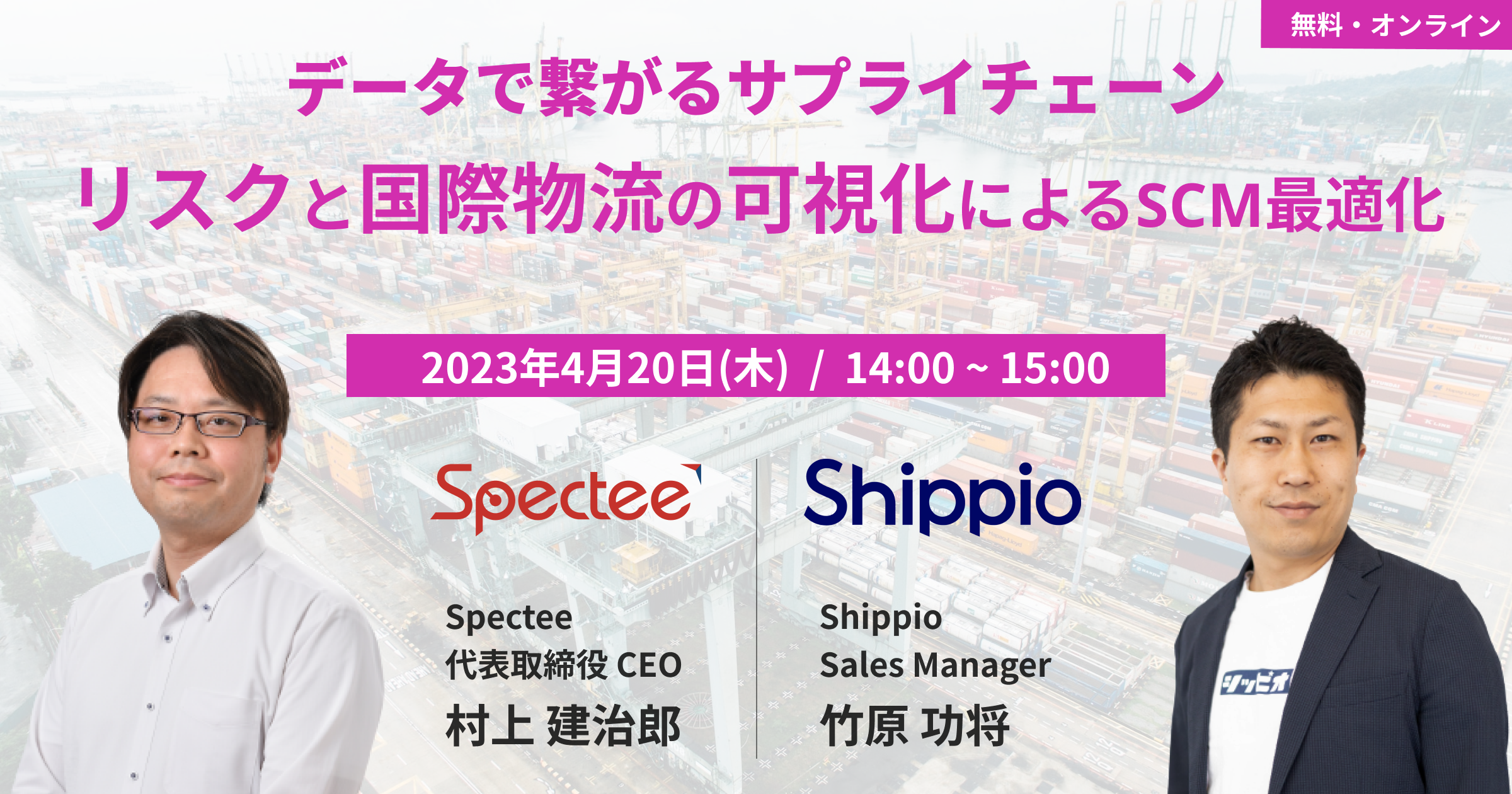 国際物流プラットフォームを提供する株式会社Shippio(本社:東京都港区、代表取締役CEO:佐藤孝徳、以下Shippio)と防災テックベンチャーの株式会社Spectee(本社:東京都千代⽥区、代表取締役 村上建治郎 以下、「スペクティ」)は、共催セミナー「データで繋がるサプライチェーン:リスクと国際物流の可視化によるSCM最適化」を4月20日(木)に開催いたします。