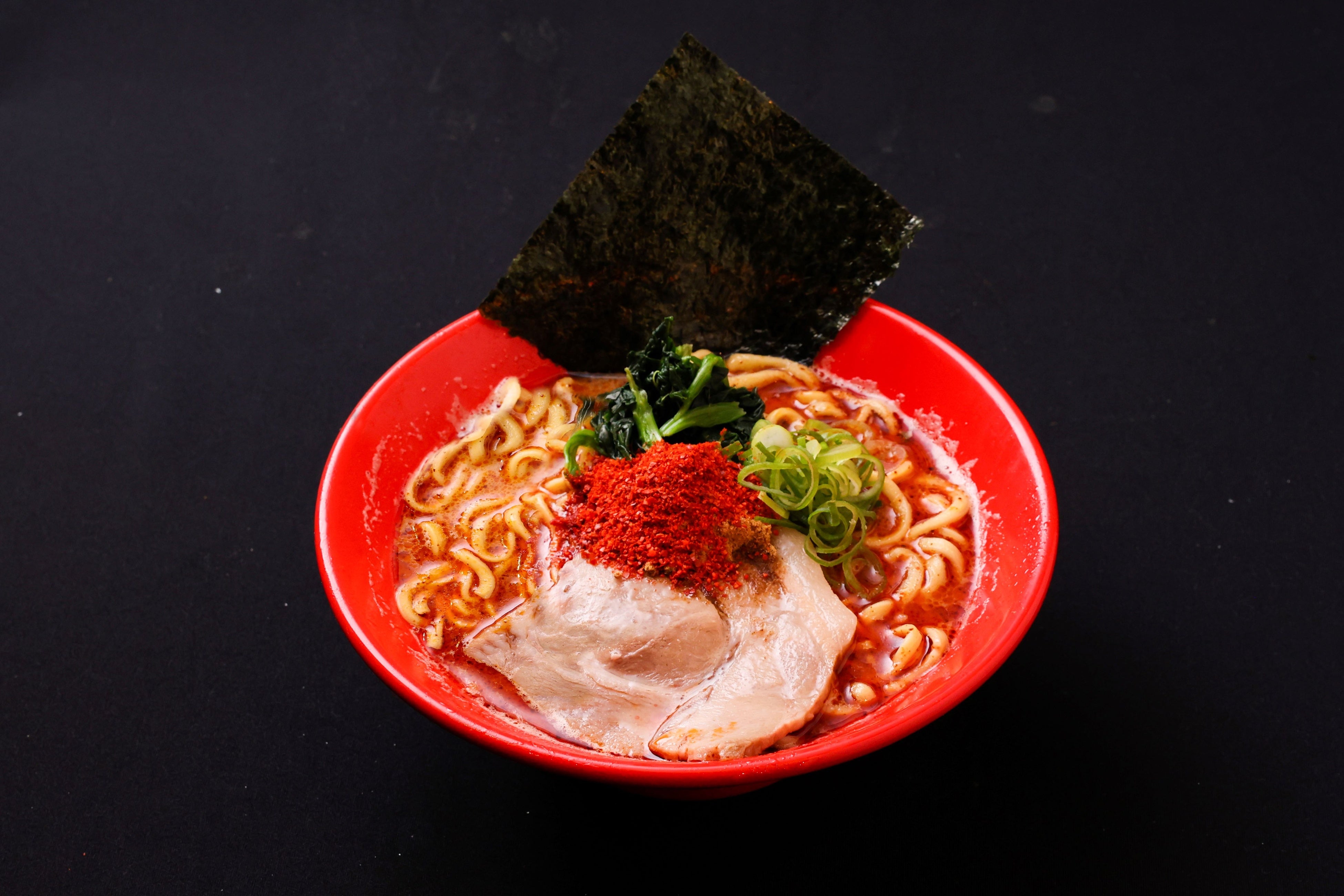 アウトレットパーク滋賀竜王店限定のラーメン。家系豚骨醤油をとびきり辛くして魚介の粉末で味付けしました。辛いのが好きな方には是非食べて欲しい一品です。