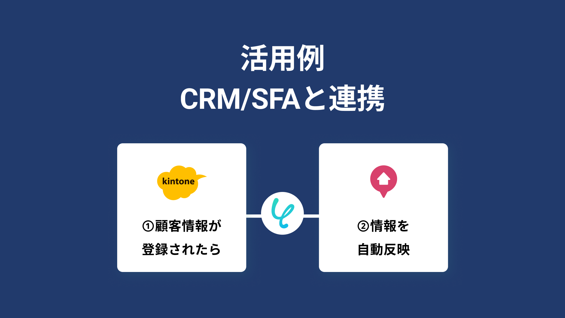 API連携設定を行うことで、KASIKA内で更新された情報(例:顧客登録、反響など)や、他のツールで更新された情報を、双方向で自動的に連携することができます。