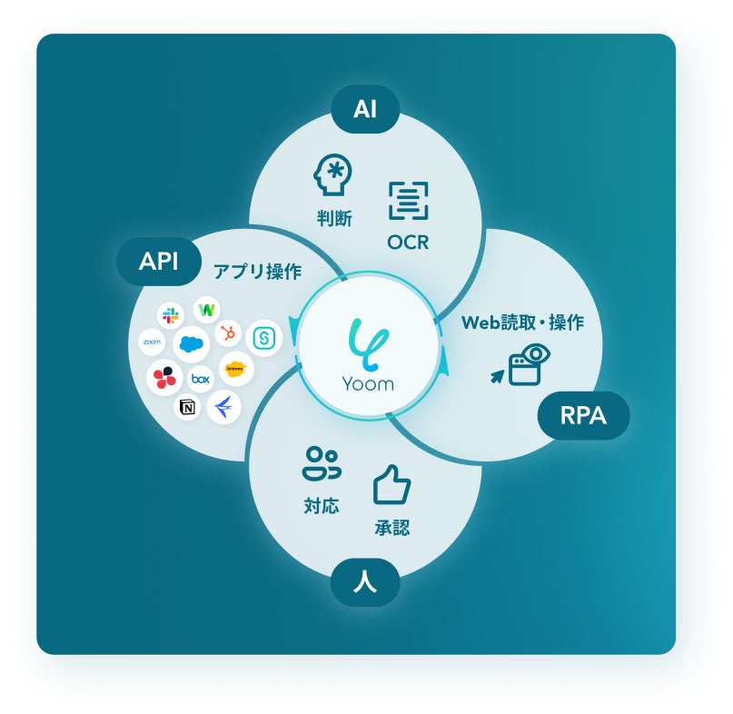 YoomはAI・API・RPA・OCRなどの様々な技術を組み合わせ、セールス・人事・労務・経理など企業内のあらゆるデスクワークを自動化するハイパーオートメーションツールです。現在700種以上のアプリ・サービスと連携しており、従来のRPAだけでは難しかった多くの事務作業を簡単に自動化することが可能です。