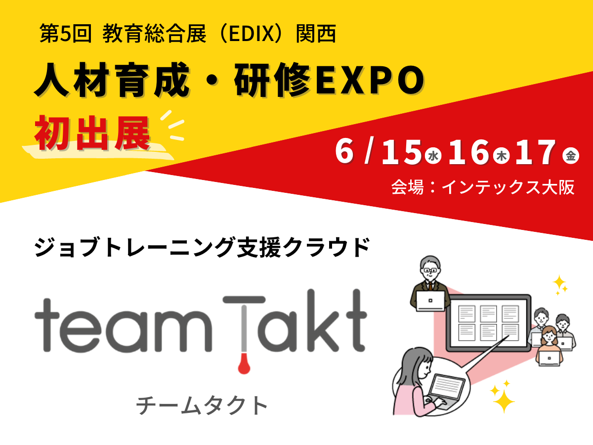 株式会社コードタクト(本社:東京都渋谷区、代表取締役:後藤 正樹、以下「当社」)のジョブトレーニング支援クラウド「チームタクト」は、6月15日(水)~17日(金)にインテックス大阪で開催される第5回 教育 総合展(EDIX)関西の人材育成・研修 EXPOに初出展します。