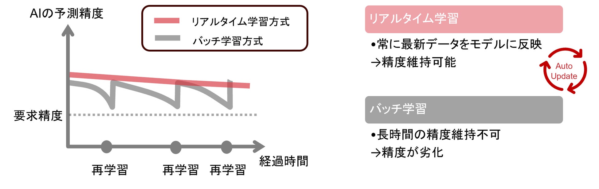 機械制御領域でAIを活用するためには、AIの予測精度を高く維持することが求められます。しかし、予測精度は時間が経つと低下していくため、再び精度の高いAIを作り直すために「再学習」を実施する必要があります。再学習の方式として、新しいデータを蓄積して定期的にAIを再構築する「バッチ学習」という手法があります。ただし、バッチ学習では、データの蓄積が必要であるためにリアルタイムでAIを更新することは出来ません。一方、「リアルタイム学習」は、データを1レコードずつ逐次的に学習することで常にAIを更新することができます。リアルタイム学習は、予測精度の低下を防ぐだけでなく、周囲の環境変化に対応することも可能です。