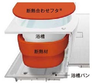 バスタブを壁パネル・バスエプロン・浴槽パンで囲む事によりできる空気層が保温効果を発揮。湯温低下を抑えます。断熱合わせフタと合わせて、約4時間後の湯温低下を2.5度以内に抑えることができます。