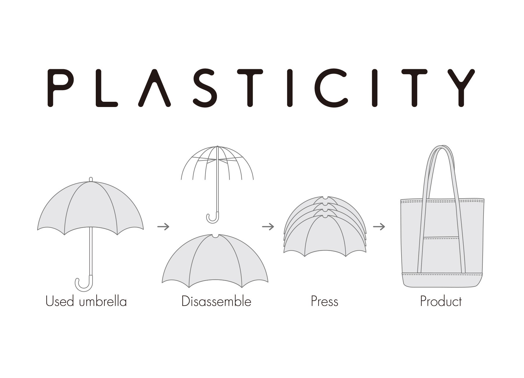 2020年4月にローンチした、廃棄ビニール傘を新たな形に生まれ変わらせるアップサイクルブランド。防水性やメンテナンス性といった傘の持つ素材の特性を最大限活かすため、そのままの状態にて何層にも重ねてプレスをする独自の加工方法を開発。さらに、加工工程にて雨模様の表情を生み出す事により独特な質感を持つ製品が完成しました。ビニール傘の回収から製品となる縫製まですべて人の手により一つ一つ細やかな作業が行われており、人間の感覚、職人の熟練した技術、素材を大切にする想いによりPLASTICITYの製品が生み出されていきます。
