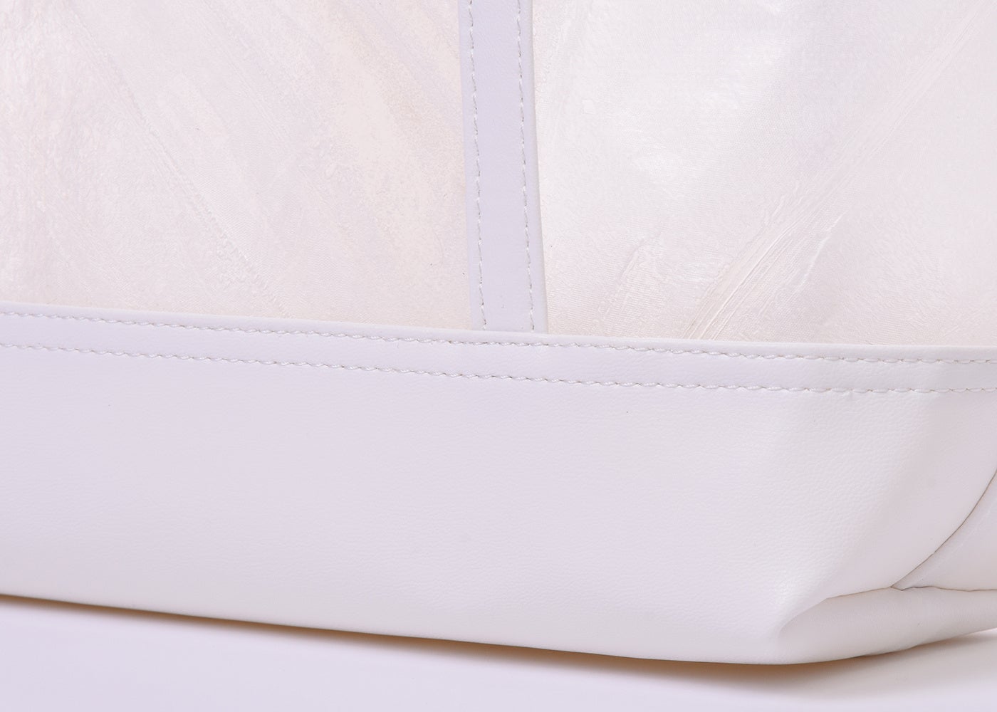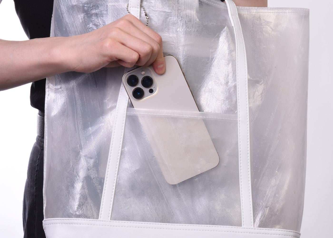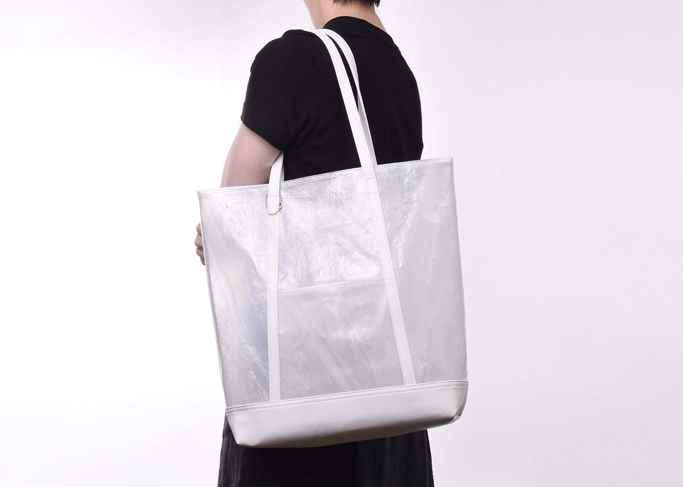 主要素材として、ビニール傘を解体し洗浄されたビニール部分を、そのままの状態で何層にも重ねて独自の加工方法で圧着して作られた素材「Glass rain」を全面に使用しています。廃材を粉砕などはせずそのままの状態にてプレスをしている為、一つ一つ微妙に表情が異なる一点ものの素材感も特徴です。また、ハンドルや本体底面には、廃棄されたリンゴから作られた植物由来のアップルレザーを採用。これにより、デザイン性と強度を兼ね備えたトートバッグが完成しました。