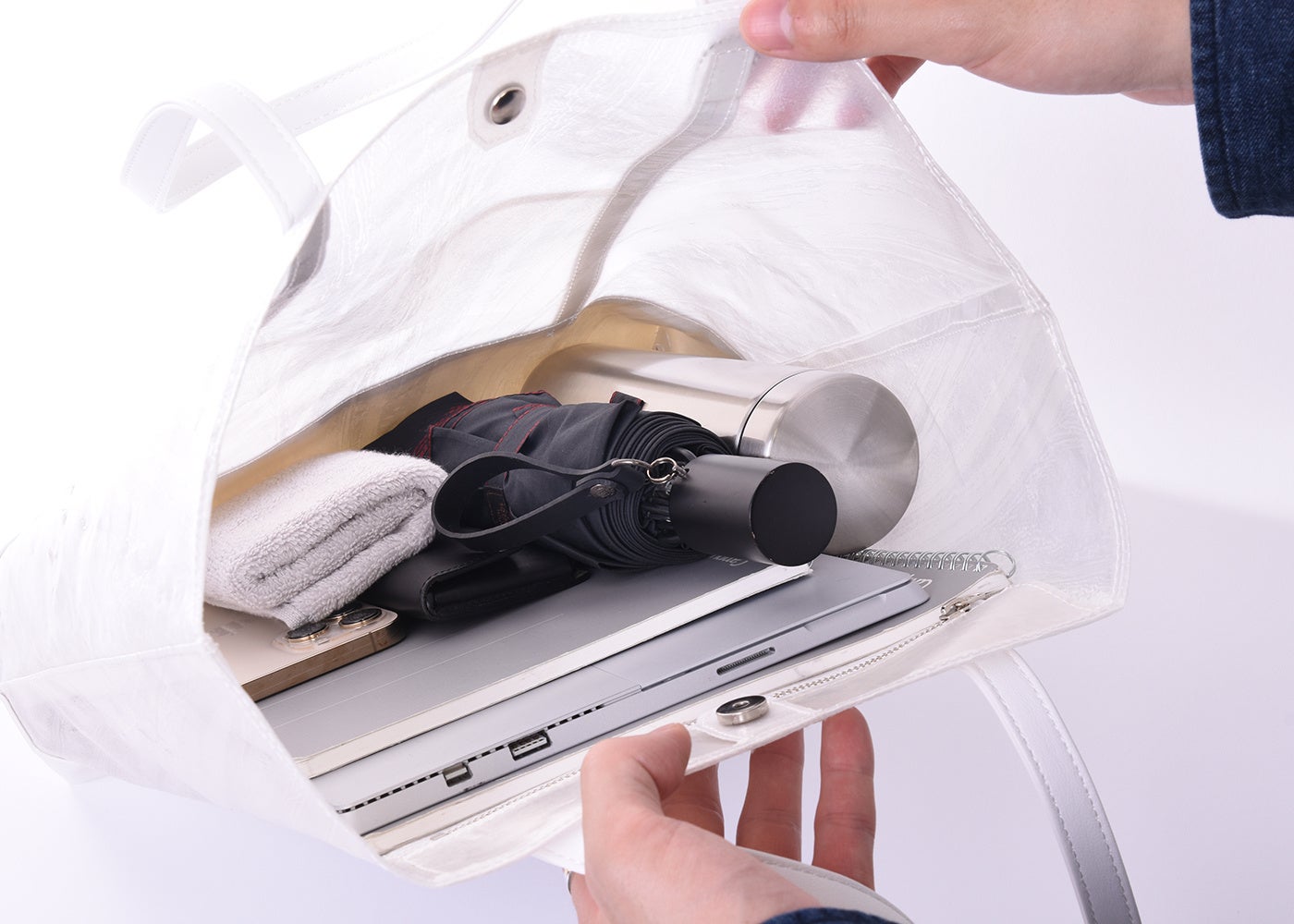 サイズと容量を綿密に計算されたスクエア型のスマートなフォルムは、A4ファイルや14インチノートPCがしっかり入る容量ながら、僅か270gの軽量化を実現。ビニール傘を再利用した素材は、雨や汚れに強いメンテナンス性にも優れている為、雨の多い季節でも普段使いにピッタリのアイテムです。