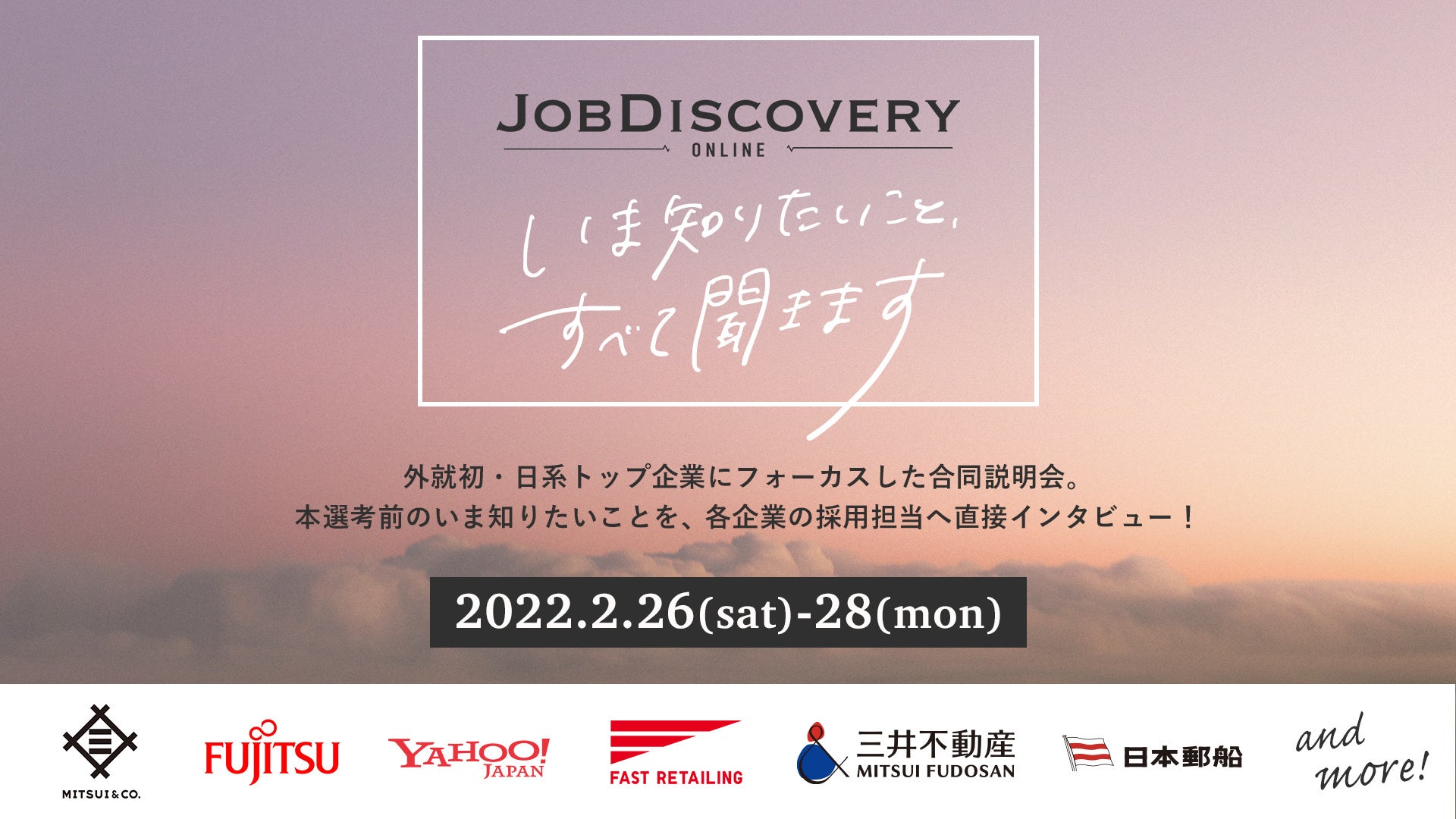 世界で挑戦したい学生を支援するキャリアプラットフォーム「外資就活ドットコム」を運営する株式会社ハウテレビジョン(東京都港区、代表取締役:音成洋介)は、2022年2月26日(土)~28日(月)の3日間、オンライン合同企業説明会「Job Discovery ONLINE」を開催いたします。