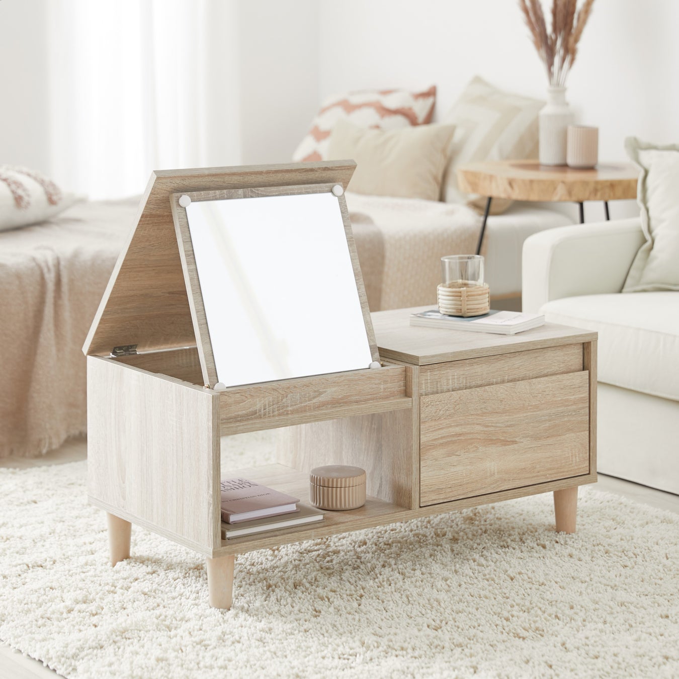 鏡の角度は3段階で調節が可能で、ポイントメイクもバッチリ対応できます!ドレッサーに必要な引き出し収納を備えつつも、自由度の高いオープン収納も完備。センターテーブルとしてソファと一緒に使えるよう、高さにもこだわりました。