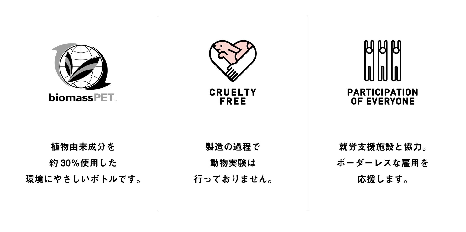 “誰一人取り残さない社会づくり”を掲げ、生産工程の一部を就労支援施設に委託、容器には植物由来素材を30%使用したバイオPETを採用、動物由来原料不使用、動物実験一切なしと、生産背景にも徹底したエシカル思考で向き合い、ひと・環境・動物にやさしい商品となっています。