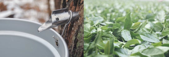 メープルシロップの原料となるサトウカエデ樹液(保湿成分)。お茶の枝葉から得られるチャ乾留液(整肌成分)。