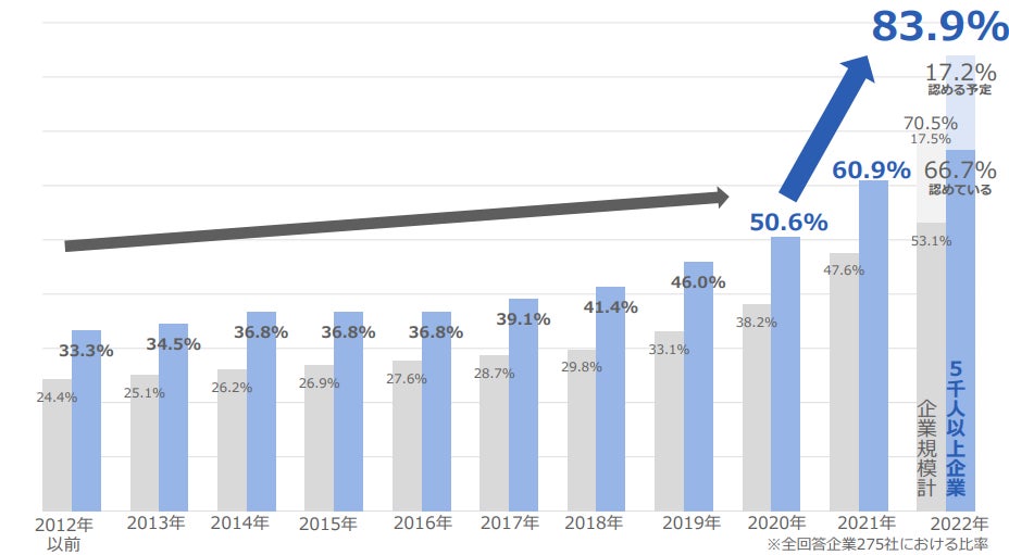 政府が推進するリスキリングをはじめとして終身雇用や年功序列といった日本型経営モデルから能力主義モデルへの移行が叫ばれる中、時間や場所に囚われない自由な働き方が浸透し始めています。経団連の調査では、2022年では83.9%の企業※1が副業・兼業を「認めている」または「認める予定」と回答しています。