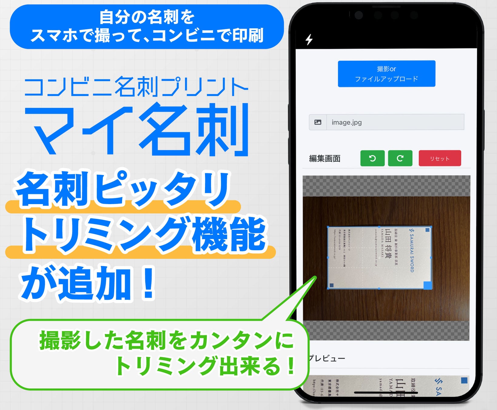 株式会社サムライソード(所在地:東京都豊島区、代表取締役:比企良公)は、自分の名刺をいつでも全国のコンビニで印刷できる「マイ名刺」のブラウザ版に「名刺ピッタリトリミング機能」を追加しました。