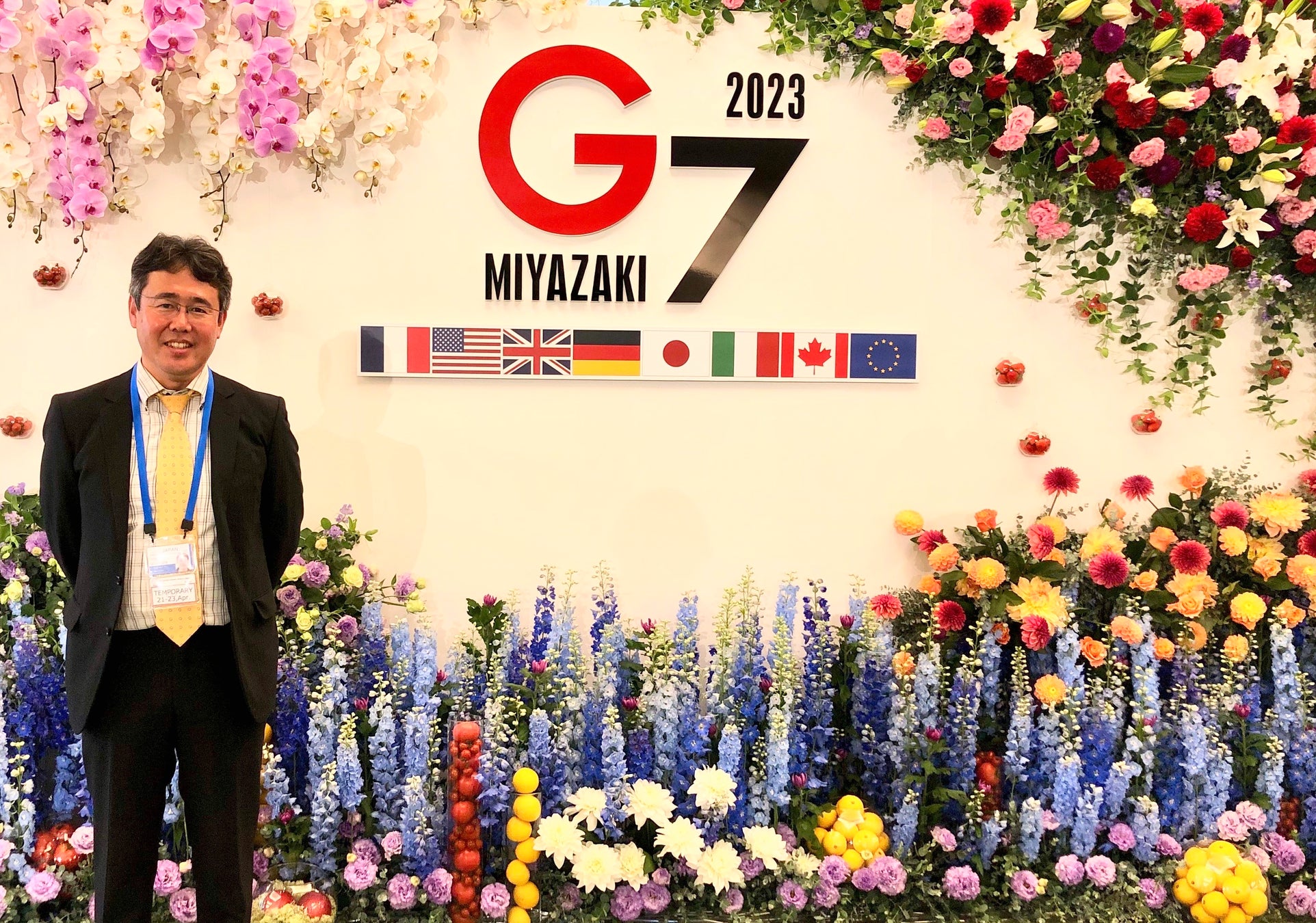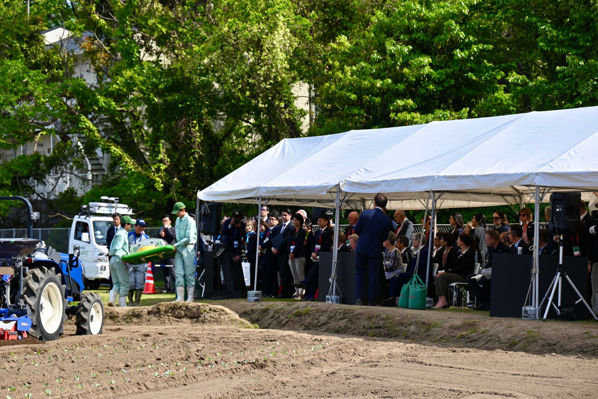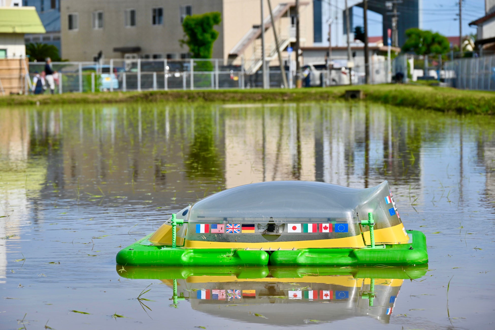 また、会合2日目には、宮崎県立宮崎農業高等学校の圃場で各国の大臣ら代表団に向けてアイガモロボの実演を行いました。日本は有機農業の面積拡大を推奨しており、実現のためには雑草対策の省力化が必須である中、そのソリューションの一つとしてアイガモロボを紹介いただきデモンストレーションがスタート。G7参加国の国旗を貼ったG7仕様のアイガモロボを県立宮崎農業高校の生徒らが田んぼに浮かべ、ロボが泥を巻き上げながら縦横無尽に全自動で動く様子を視察いただきながら、ロボの特性やスペックを説明、その中で、水稲栽培が行われているイタリアの企業からも購入希望のお問い合わせがあり、今後海外への販売にも積極的に取り組んでいく予定であることに触れ、水田文化の根付くイタリアのフランチェスコ・ロッロブリージダ農業・食料主権・森林大臣が笑顔で大きく頷いておられました。最後に当社の中村が、「昨年度の実証実験でメタンガスの排出量を半減できた結果も出ており、引き続き検証を重ね、効果を発信していきたい」とPRし、各国の閣僚陣を前に世界へ印象付けました。