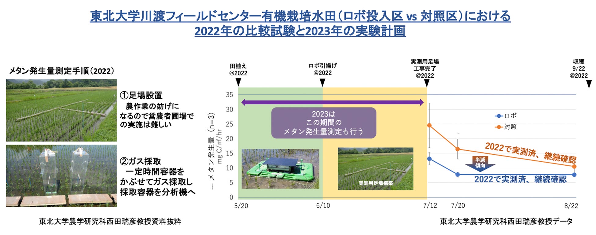 今回、G7の会場で紹介したメタンガスの削減効果は、東北大学東北大学農学研究科 西田瑞彦教授が2022年に行った実証実験に基づくもので、アイガモロボを使用したロボ投入区と使用していない対照区を比較し、水田から発生するメタンガスが半減する傾向が確認されました。今年度も同様の実験を重ね、2023年秋の日本作物学会で論文を発表する予定です。
