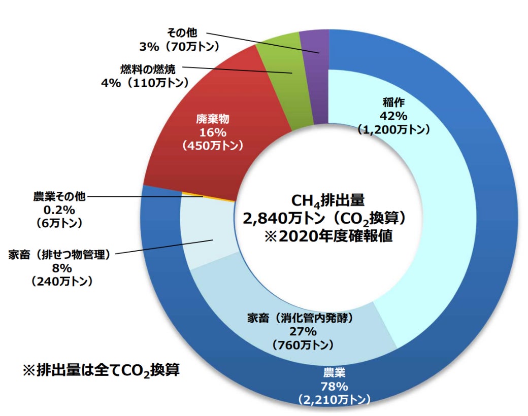 環境省の“2020年度温室効果ガス排出量”のデータによると、日本国内におけるメタン(CH4)排出量(CO2換算)は2,840万トンで、そのうち農業分野(稲作・家畜)からの排出量は全体の78%を占めており、中でも稲作は42%(1,200万トン)に達します。地球温暖化を食い止めるためには、こうした農業分野の排出量削減に向けた積極的な取り組みが必要不可欠で、アイガモロボを使用することで、メタンガス削減にも大きく寄与できる可能性があると考えています。