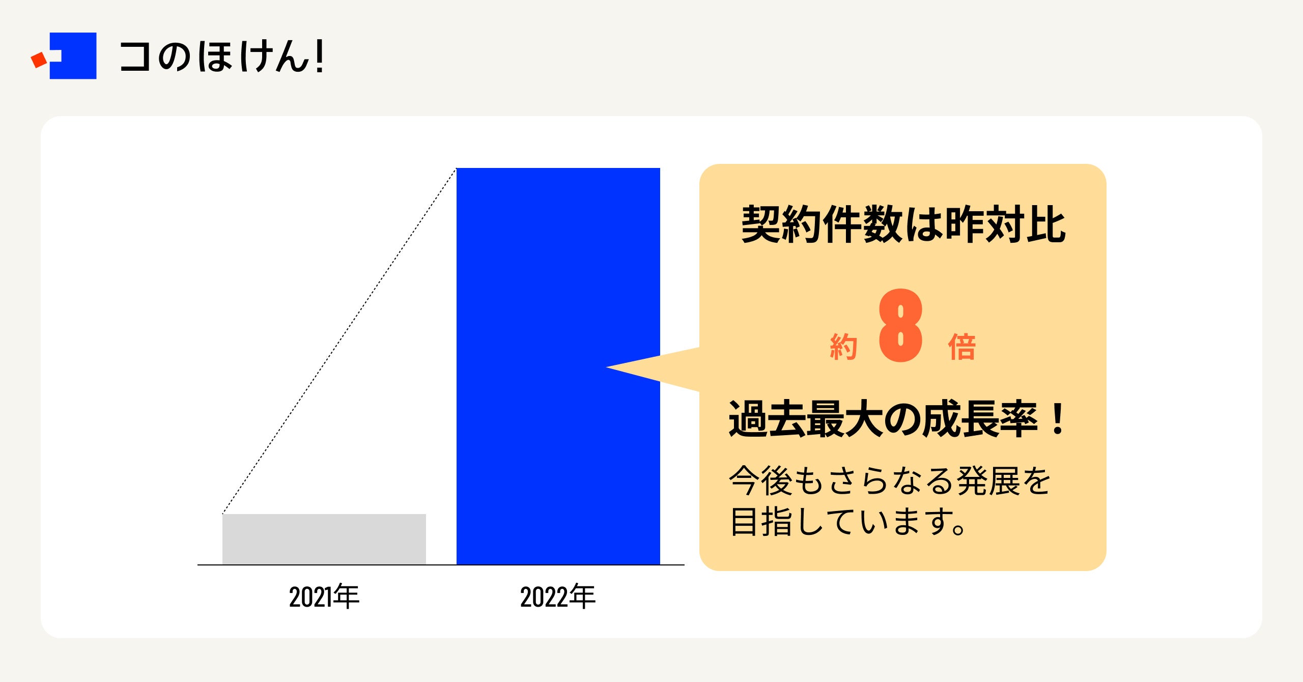 2021年9月にリブランドした「コのほけん!」は1周年を迎え、契約件数は昨対比8倍に急成長しています。